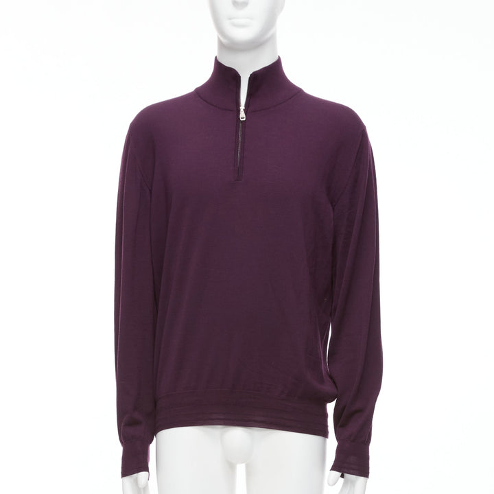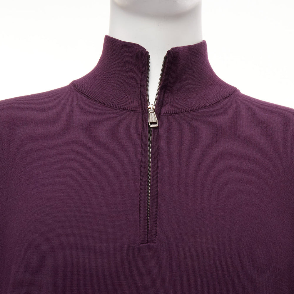BRIONI 100% wool eggplant purple silk trimmed half zip long sleeve sweater