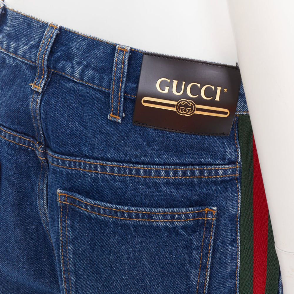 GUCCI blue cotton blend signature green red web trim straight leg jeans 31"