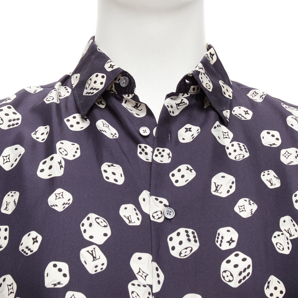 LOUIS VUITTON navy cream 100% silk LV logo dice print regular fit shirt M