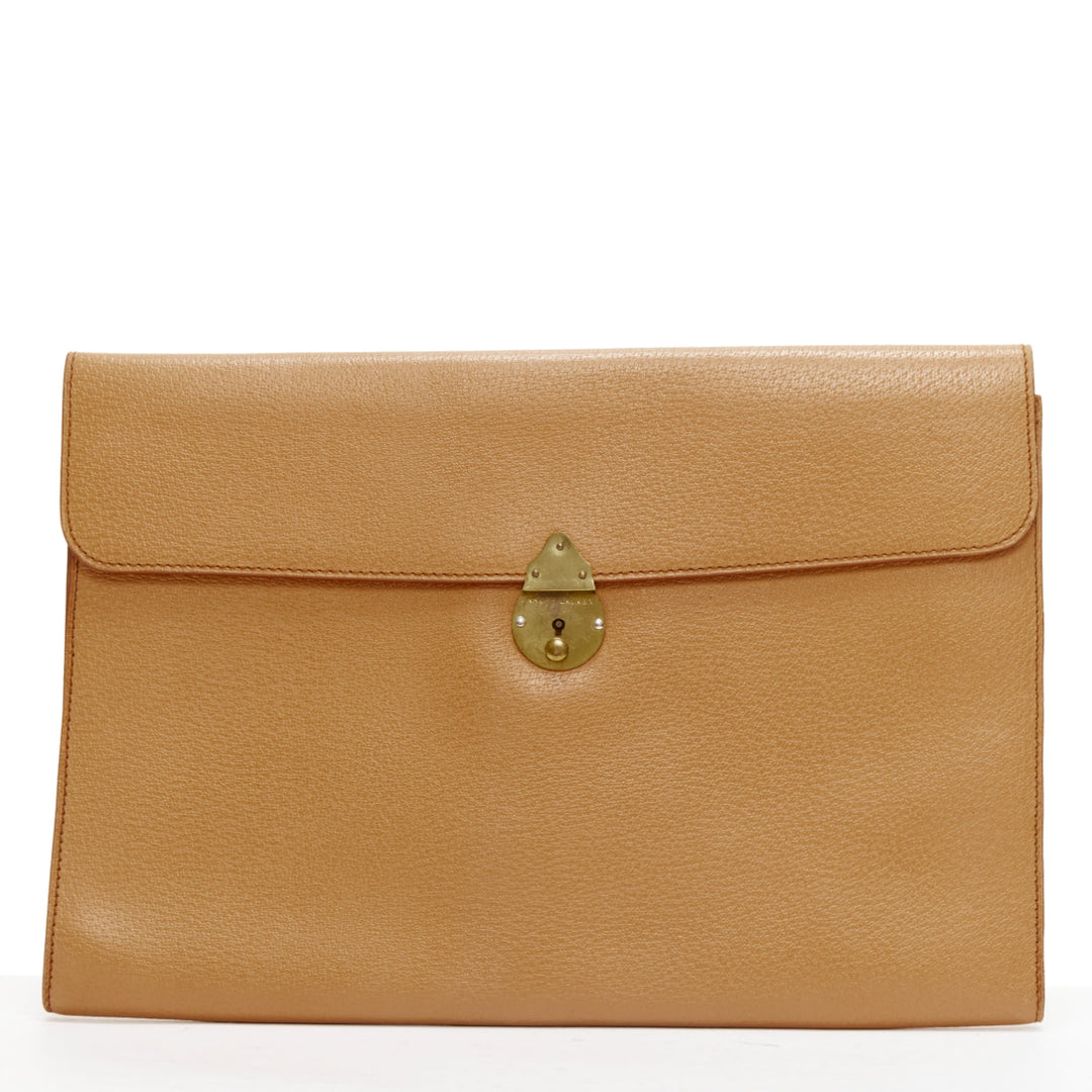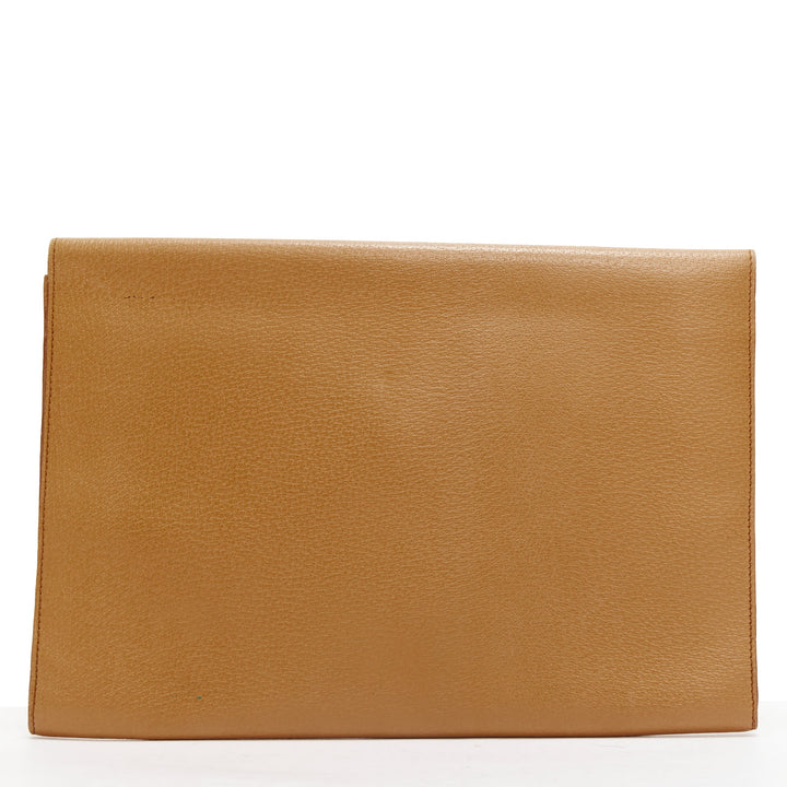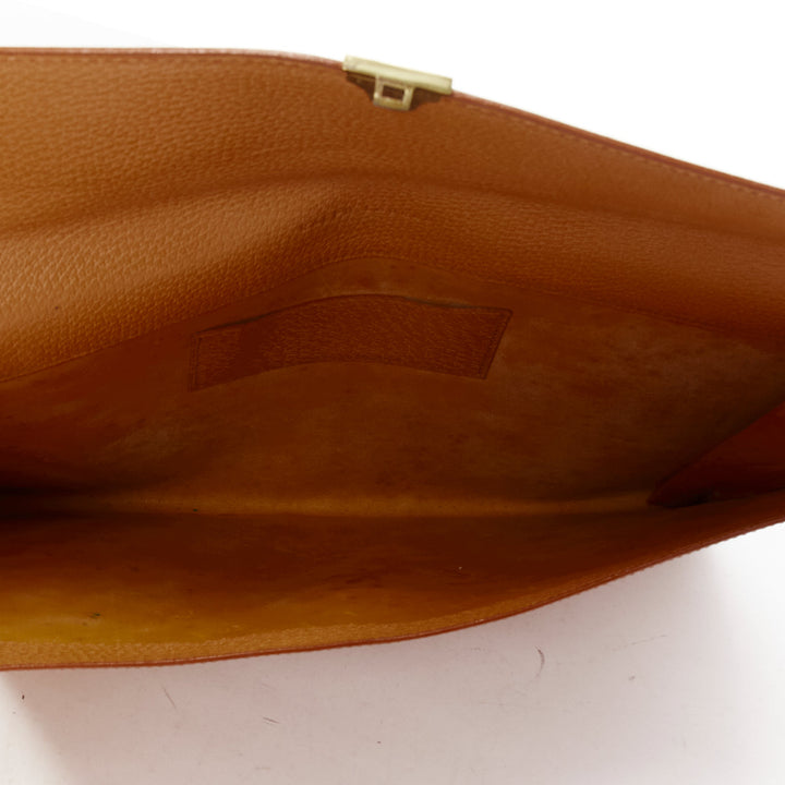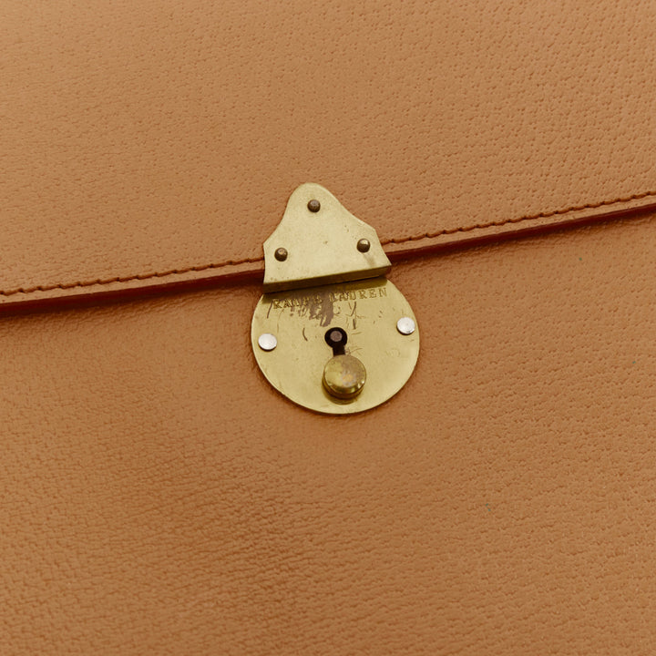 RALPH LAUREN tan textured leather gold logo push lock flap flat clutch bag
