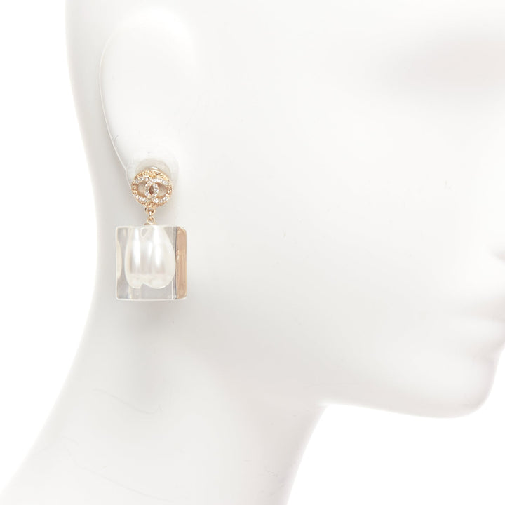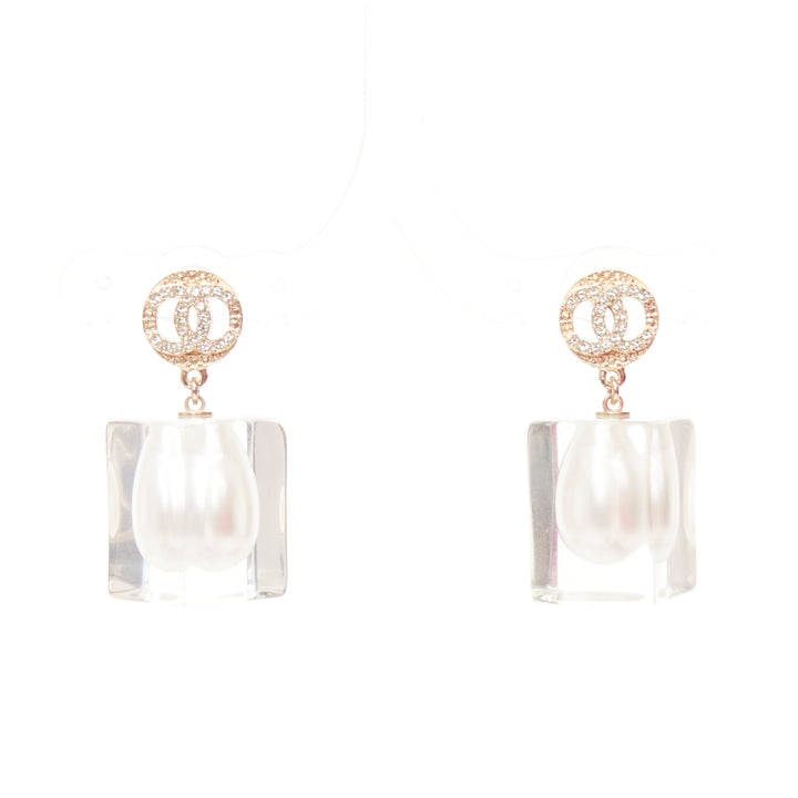 CHANEL A19K CC crystal clear acrylic encased white pearl pin earrings Pair