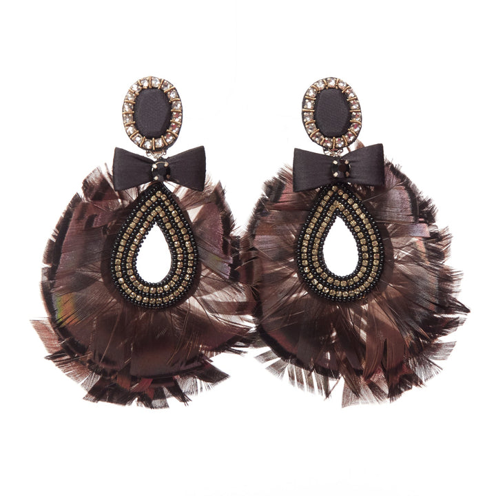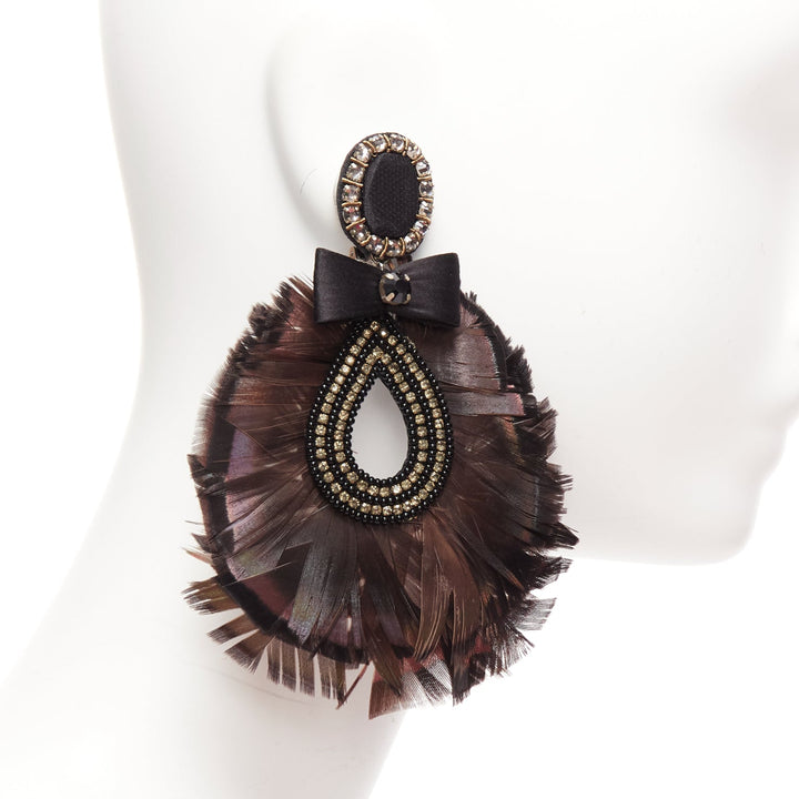 RANJANA KHAN black holographic feather crystal bow dangling clip earrings Pair