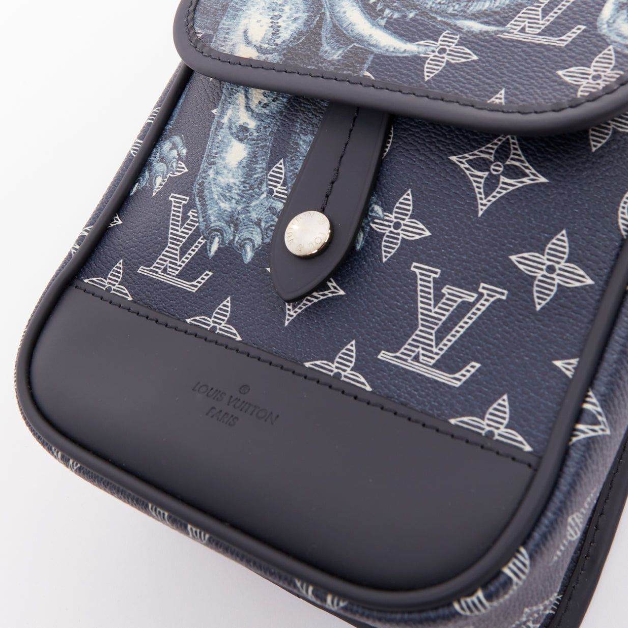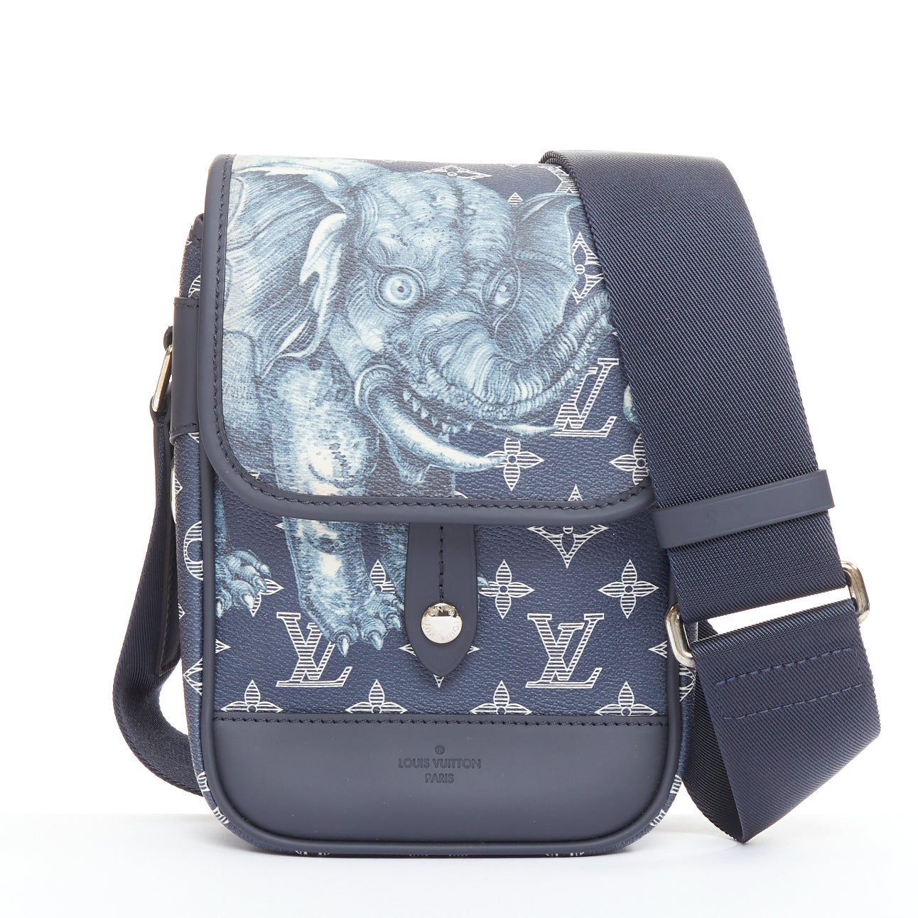 Extra Details: An iconic Monogram canvas in a striking blue colorway. A whimsical and eerie elephant motif illustration on the front flap. Coated canvas with cowhide leather trim and a textile lining. A crossbody bag style with an adjustable shoulder strap and silver-tone hardware.