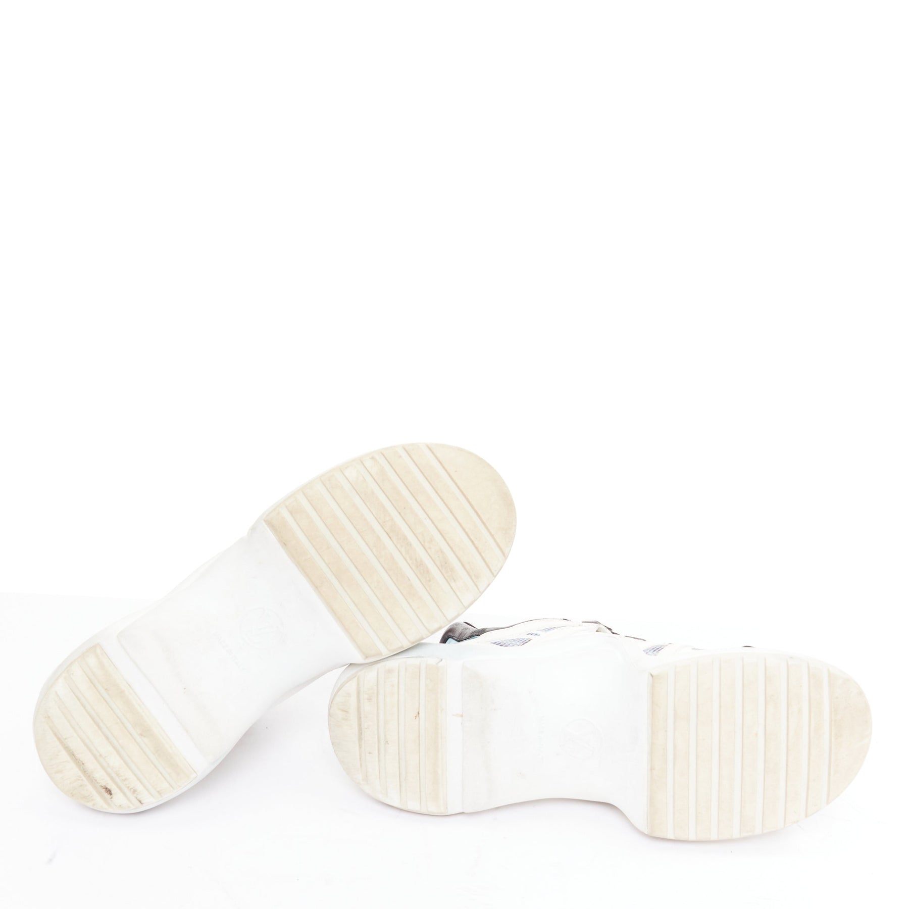 Condition: Fair, this item was pre-owned and is in fair condition. Please refer to image gallery for thorough condition check. The sneakers have dirty midsoles with color transfers, dirty white leather parts at the uppers, and blue color transfer at the right shoe near the tongue.