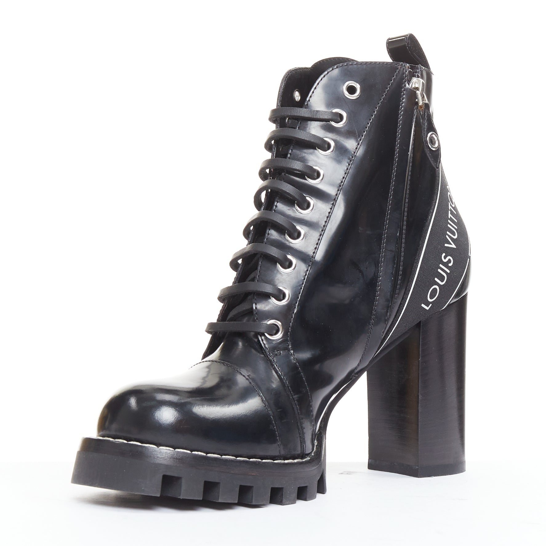 Extra Details: They are crafted from a combination of shiny patent calfskin leather and technical canvas stitching around the welt. Lace-up front with silver-tone eyelets, a functional side zip for easy wear, a chunky, rugged platform sole, and a prominent high block heel. The side of the boot features the "LOUIS VUITTON" logo written in white text on a contrasting strip.