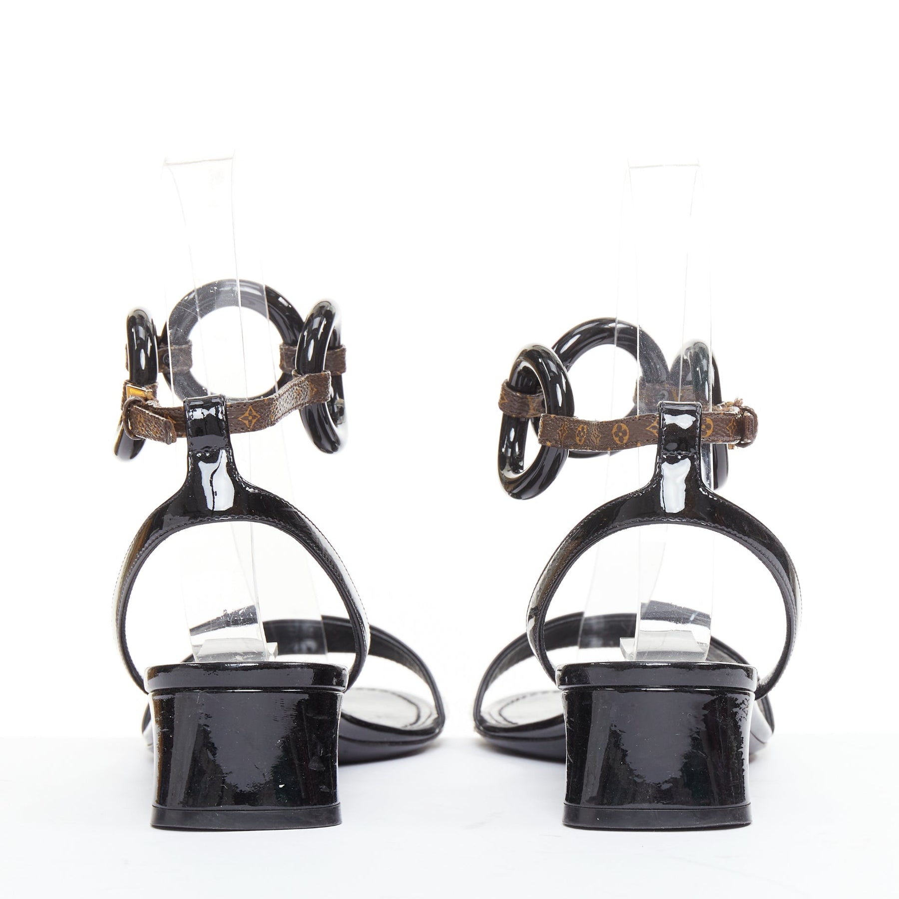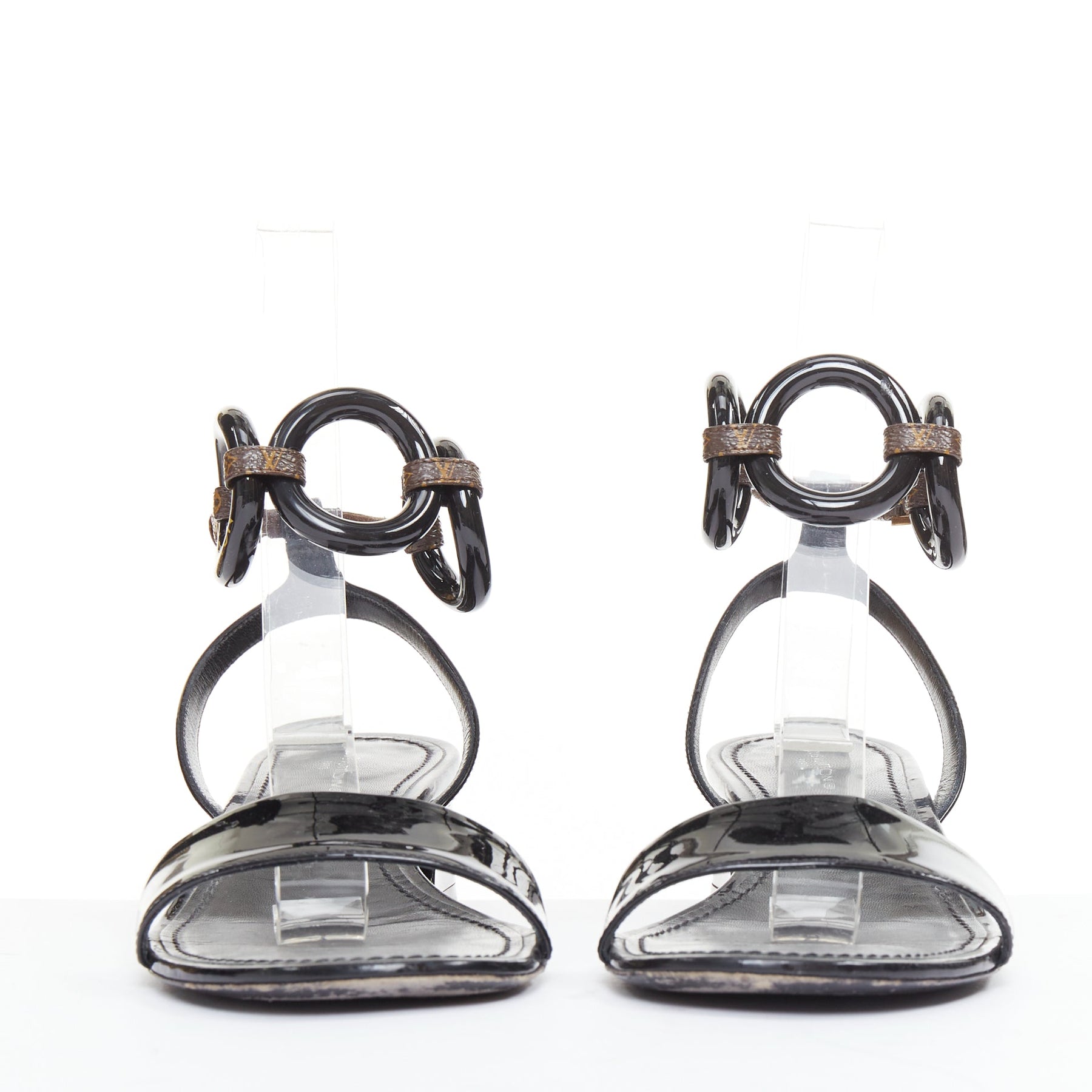 LOUIS VUITTON Vedette black patent brown LV monogram logo sandals EU38