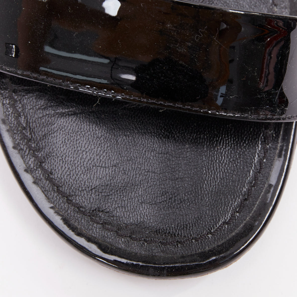 Condition: Fair, this item was pre-owned and is in fair condition. Please refer to image gallery for thorough condition check. Some stains and scuff marks are present on the patent upper, and there is slight cracking at the insoles.