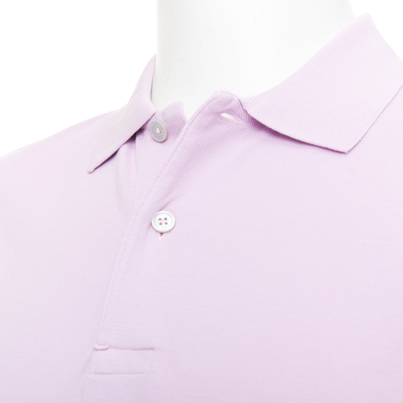 Extra Details: Tom Ford Piqué Polo Shirt. It is a light purple, short-sleeve polo with a classic collar and three-button placket. TF logo embroidery at hem.