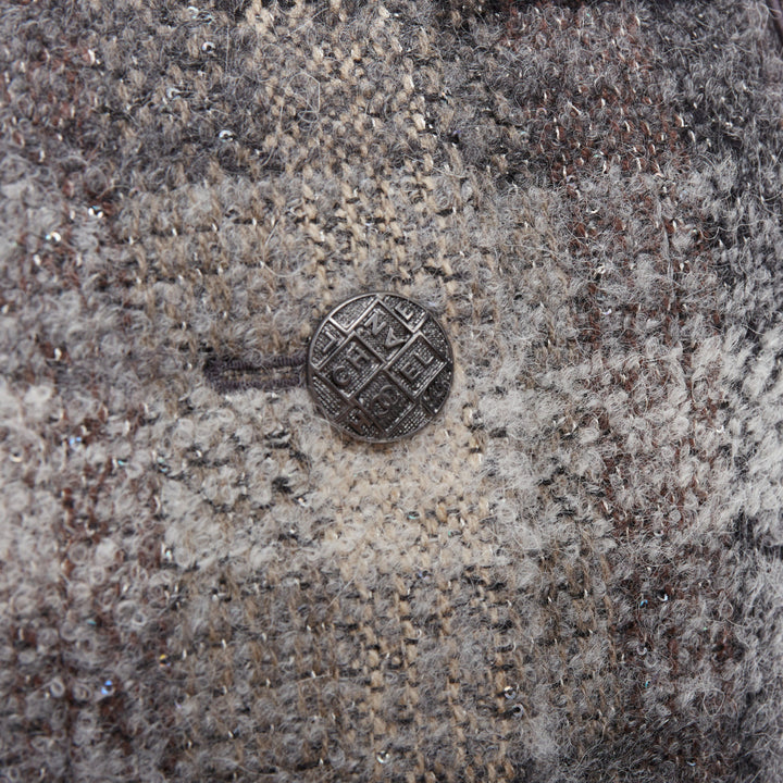 Extra Details: Wool blend Fantasy tweed. Grey, black & ecru with tiny sequins to give slight shimmer. CC logo buttons in silver. Grey logo silk lined. Panelled back.