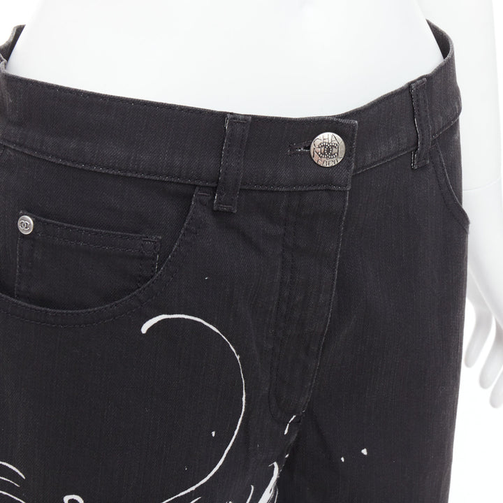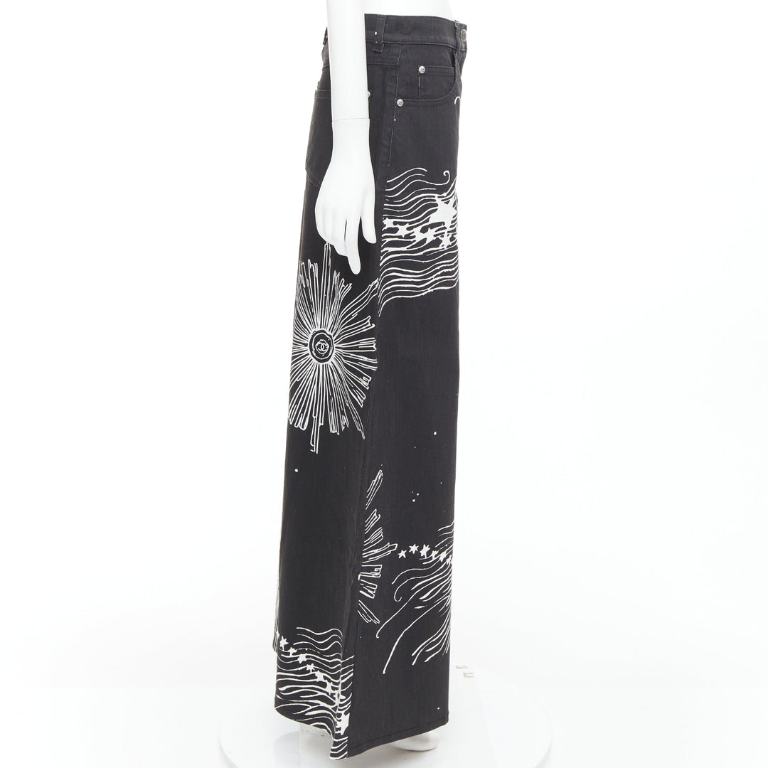Extra Details: Rare and iconic Chanel Cruise 2022 Runway Look 11 wide black jeans in size 36 FR. Black denim with a beautiful white horoscope print including the Double C Chanel logo. Double C logo button, zip and rivets. Wide-legged silhouette.