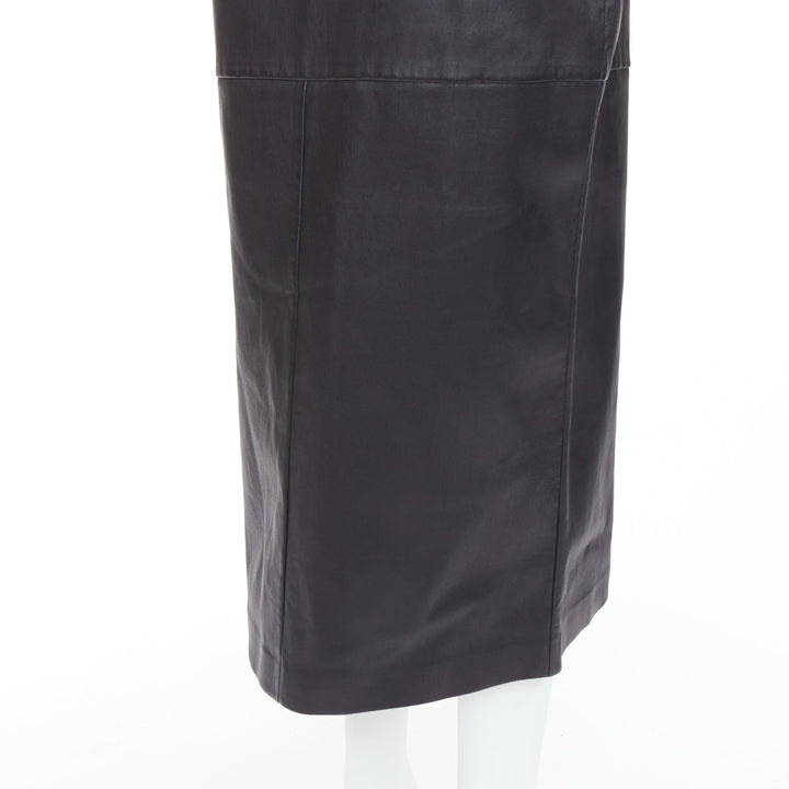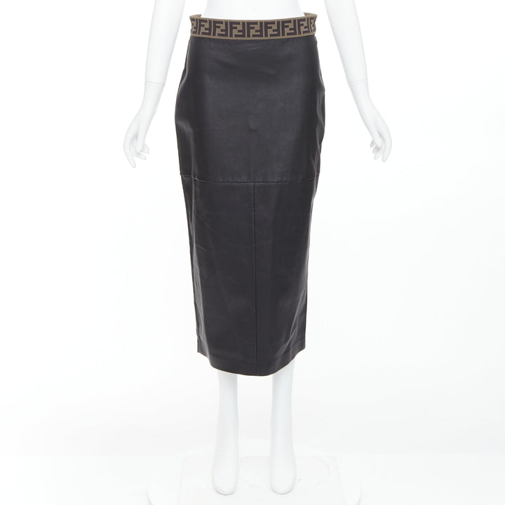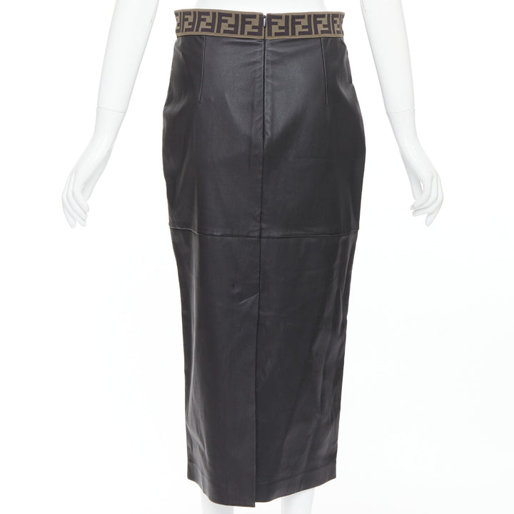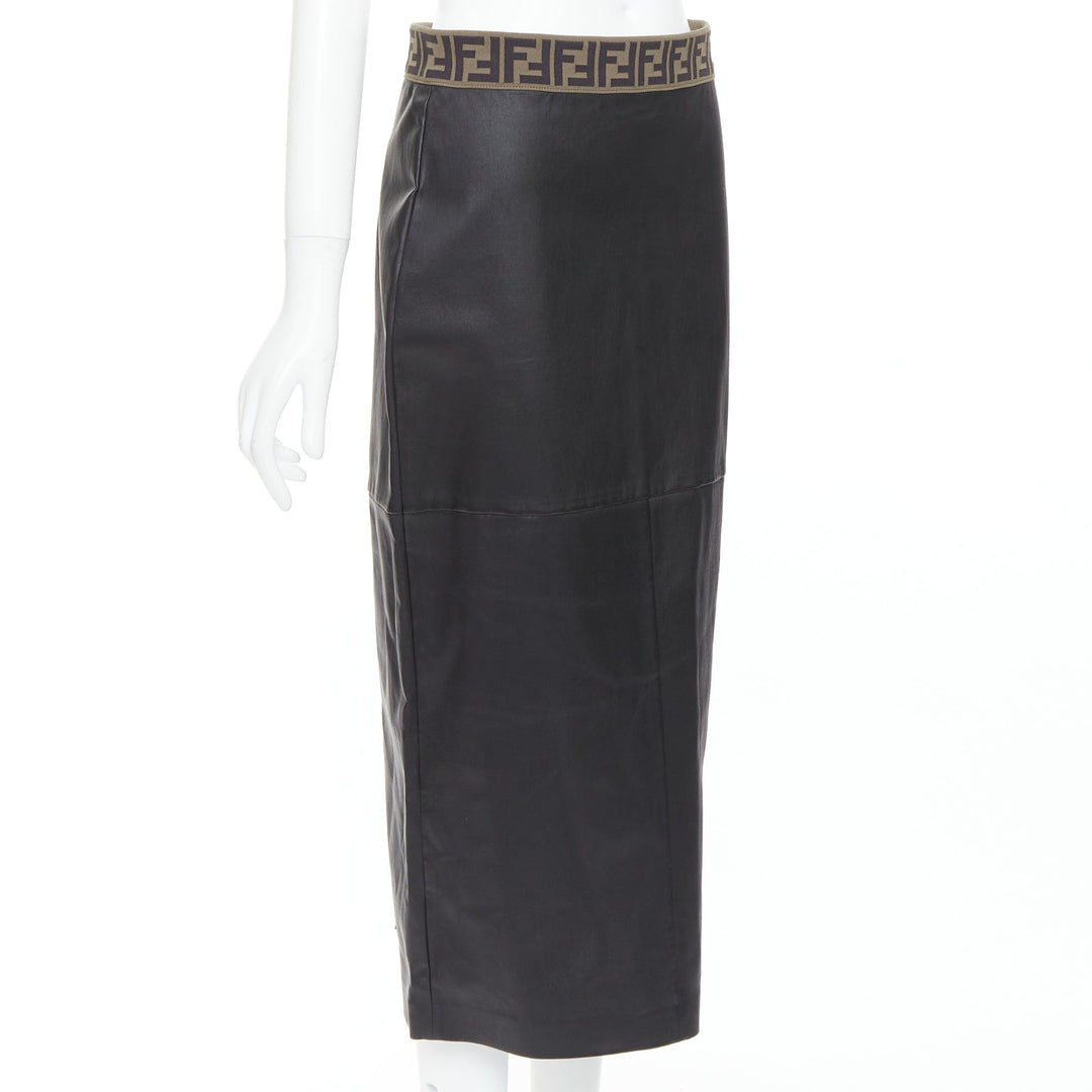 FENDI Gonna khaki FF monogram waist black lamb leather pencil skirt IT44 L