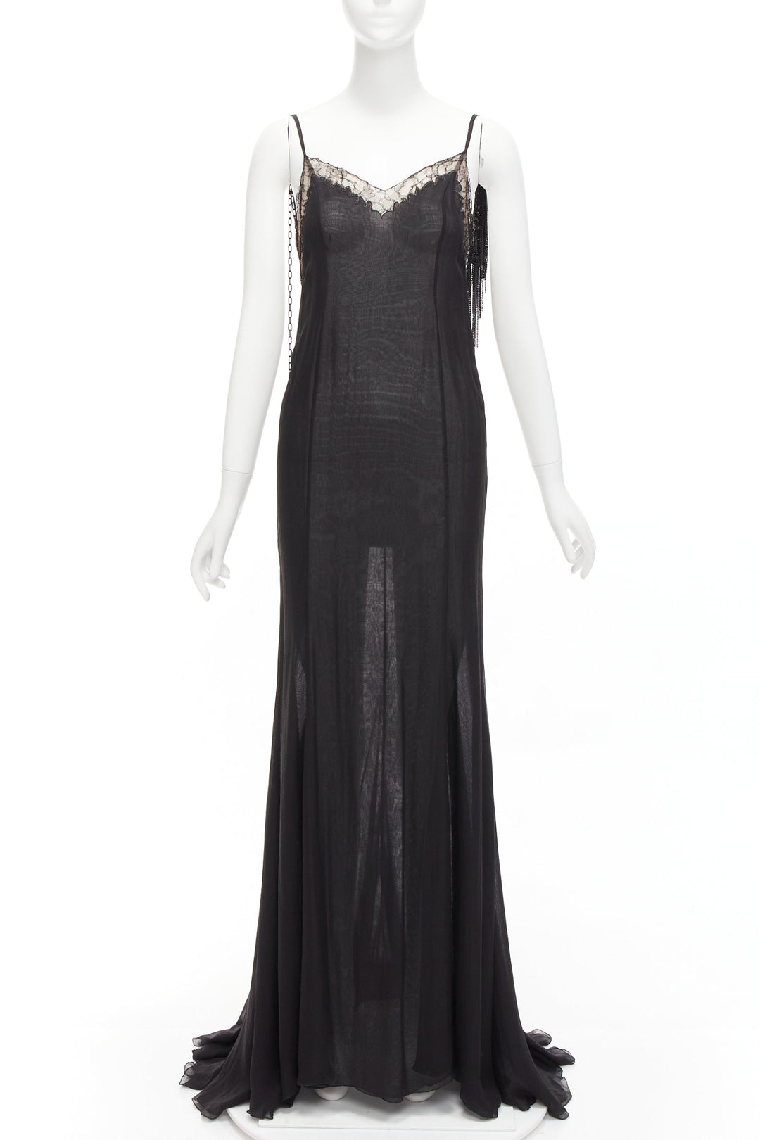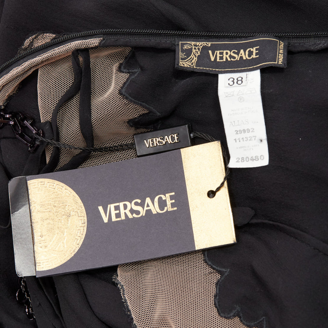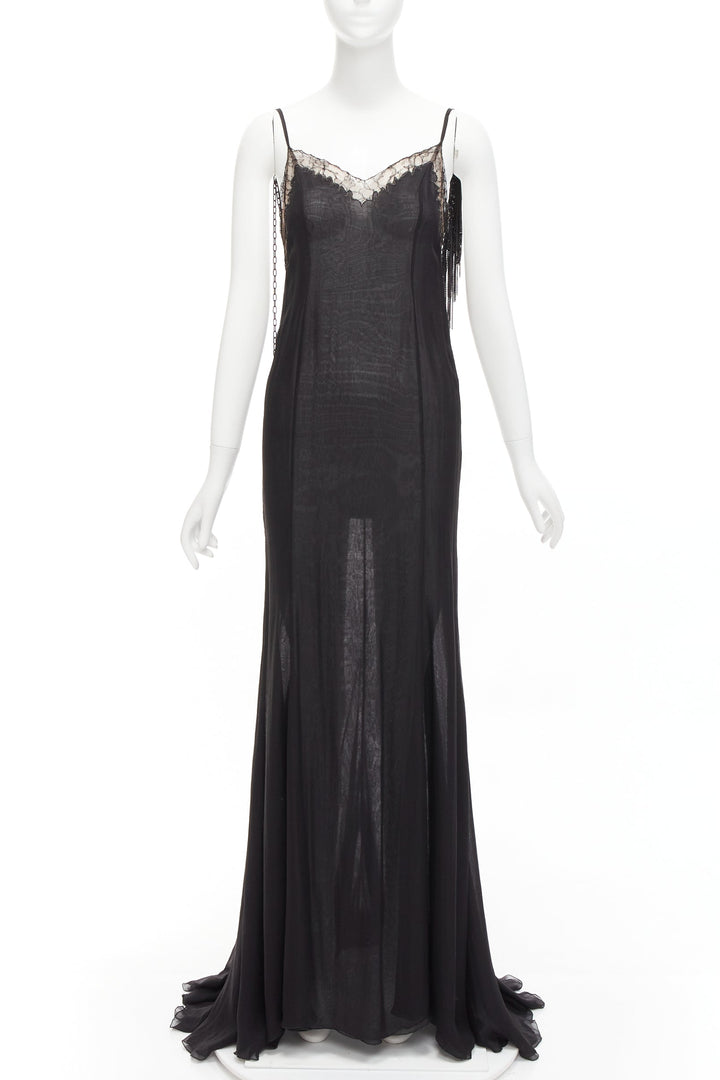 GIANNI VERSACE Vintage black punk chain detail lace trim sheer long gown IT38 XS