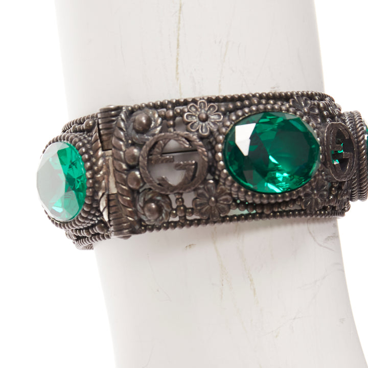 GUCCI Alessandro Michele GG logo green crystal antique gunmetal bangle