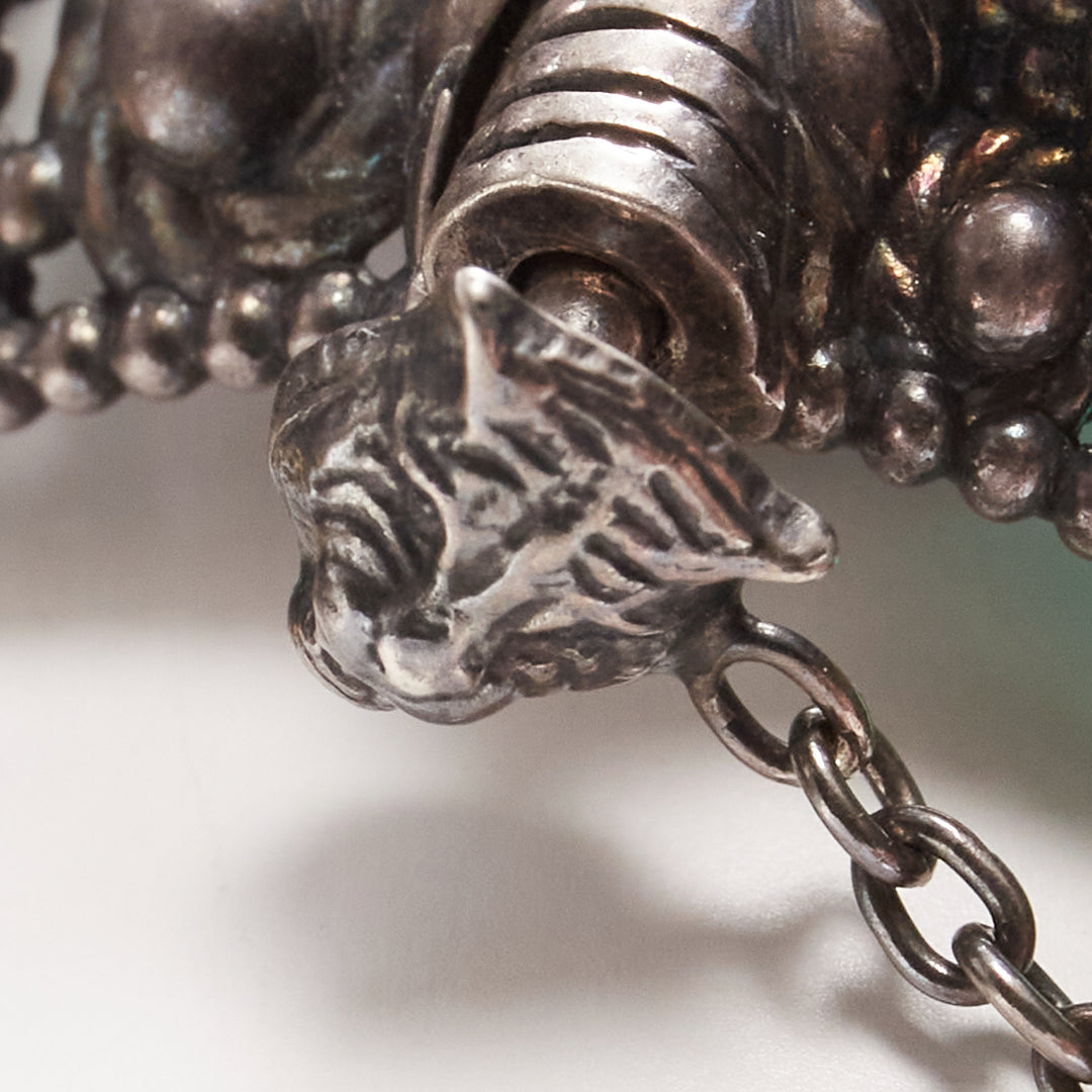 Extra Details: Blackened antique finished silver. Green-tone crystal rhinestone embellishment. GG logo design.