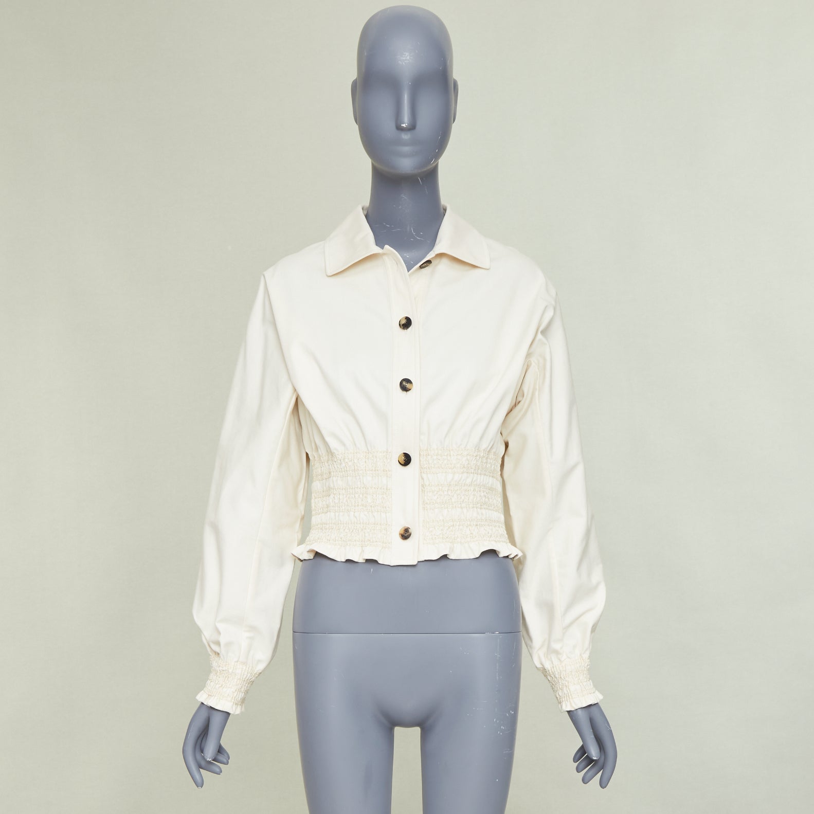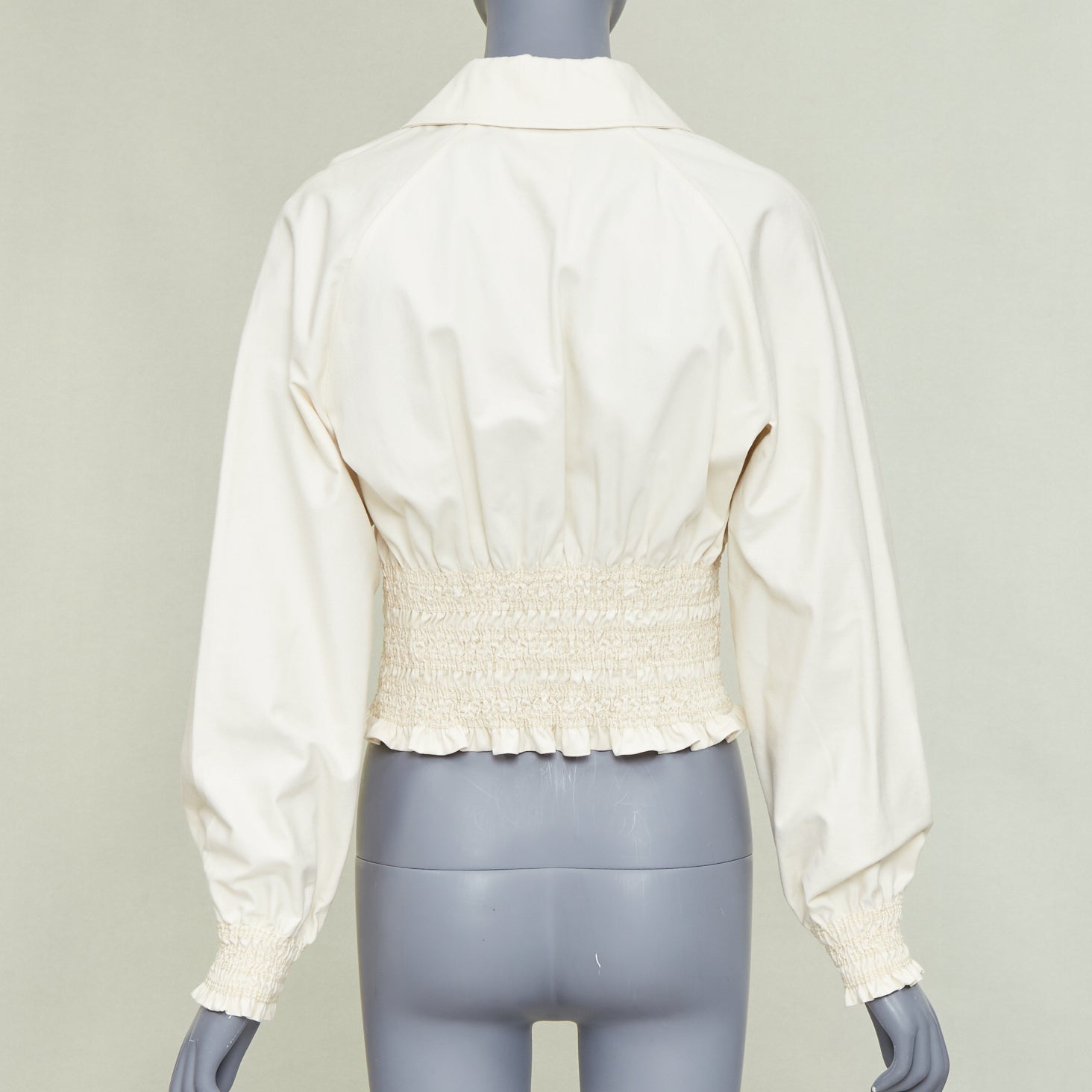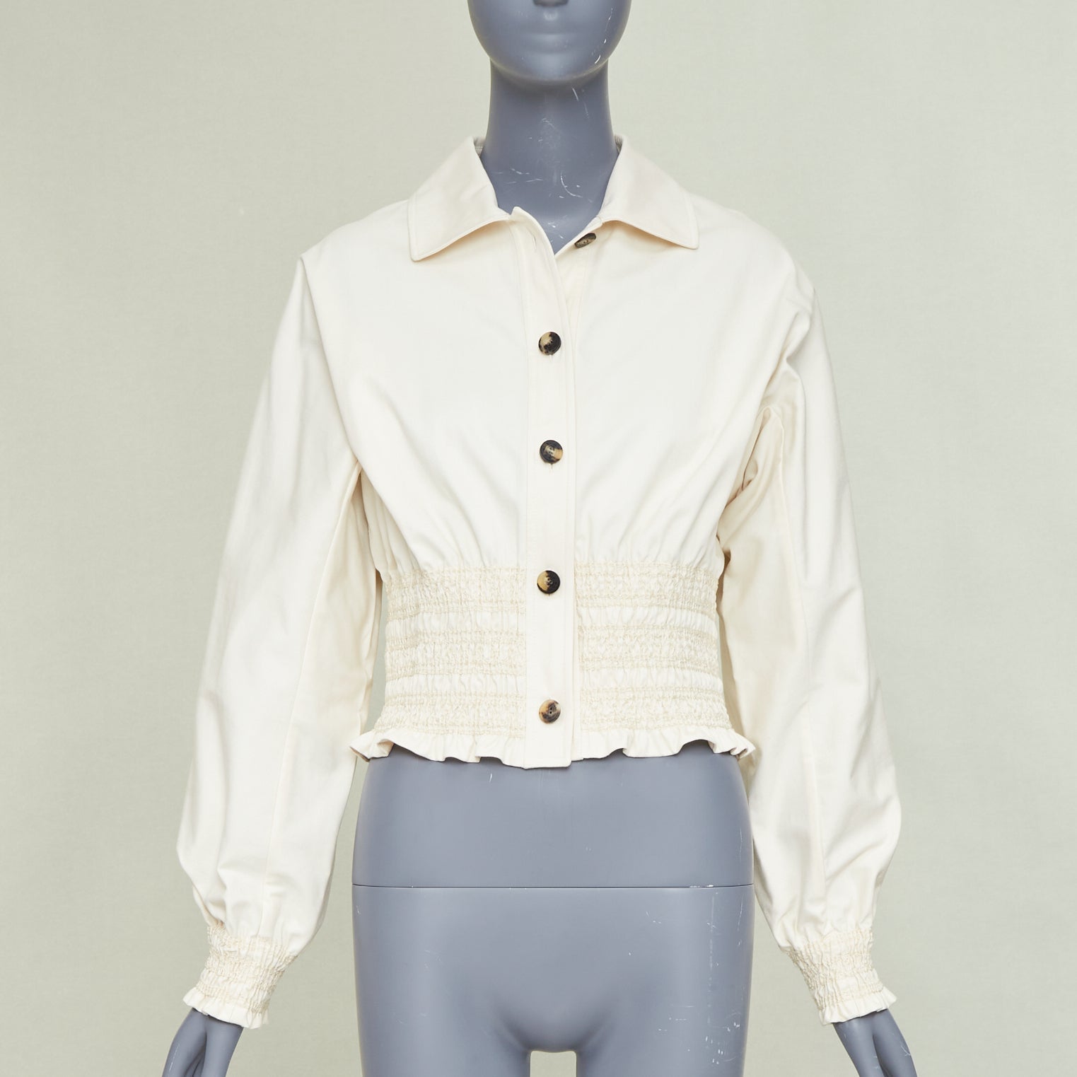 Extra Details: HERMÈS "Crude Cell" jacket is crafted from a structured, mid-weight ivory cotton fabric. Debuting in the 2020s collections, it features a distinctive wide smocked elastic panel at the waist that creates a cinched, feminine silhouette with a subtle ruffled peplum hem. The design includes a classic pointed collar, balloon sleeves with smocked elastic cuffs, and a vertical front closure detailed with four large dark contrast buttons. This unlined piece combines utility-inspired shirting with high-end architectural tailoring.