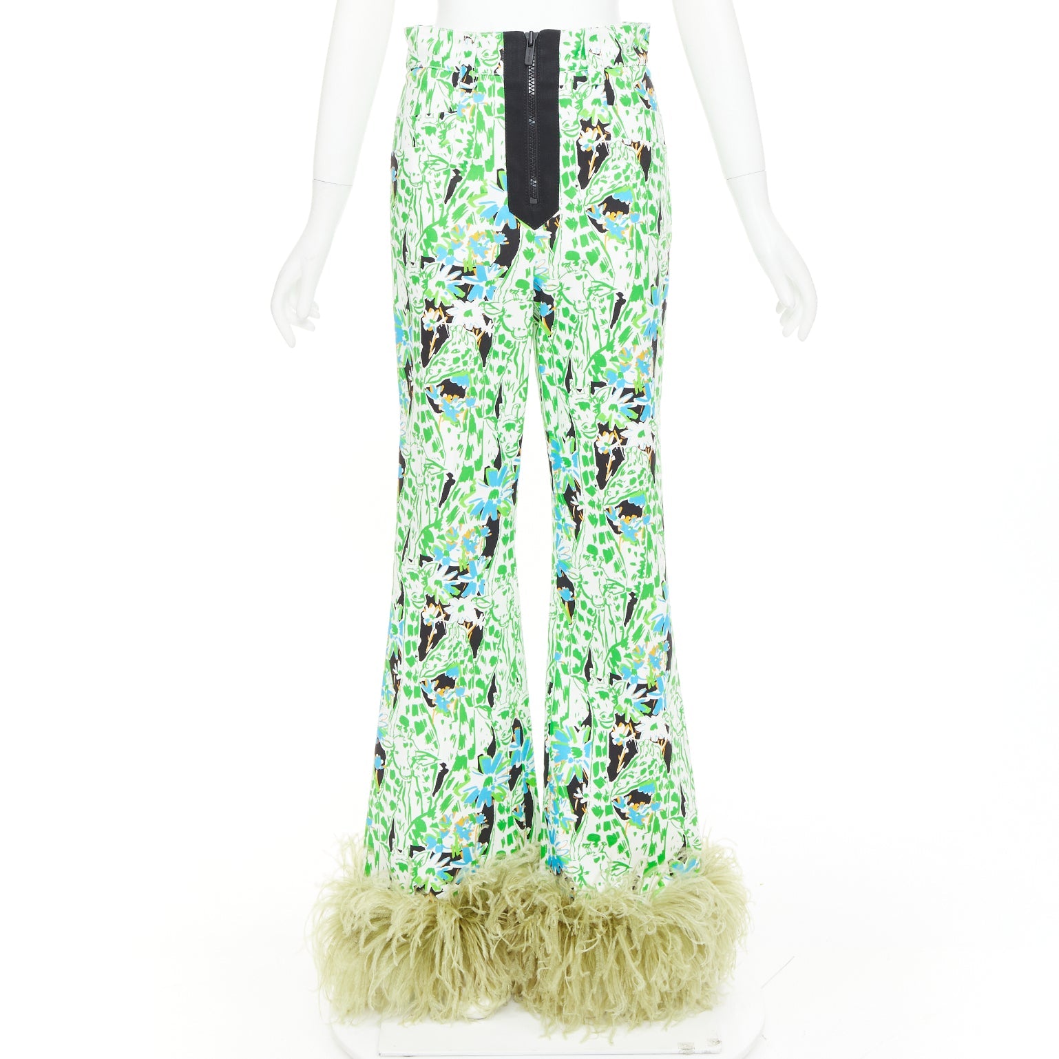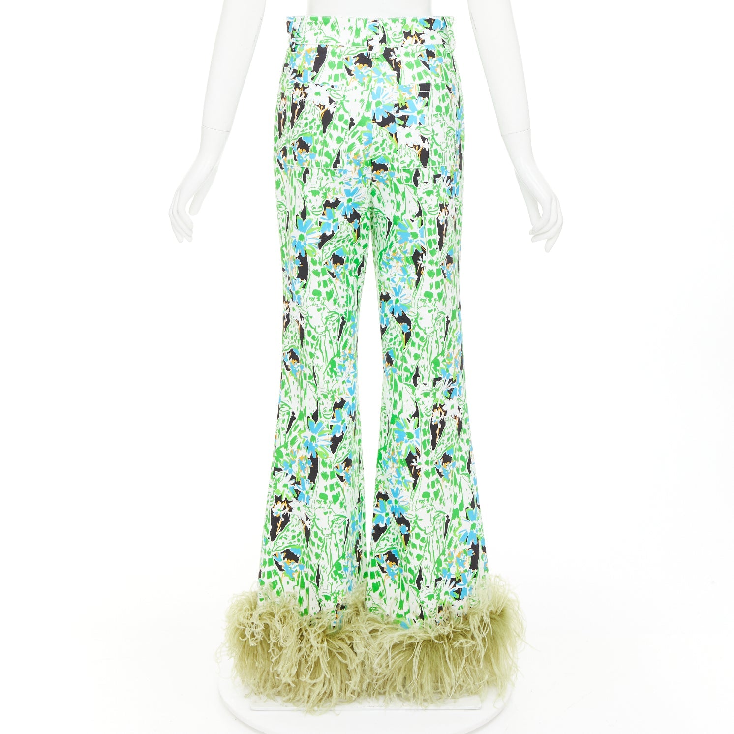 MIU MIU 2018 Runway green multi giraffe print feather hem flared pants IT40 S Natalie Portman
