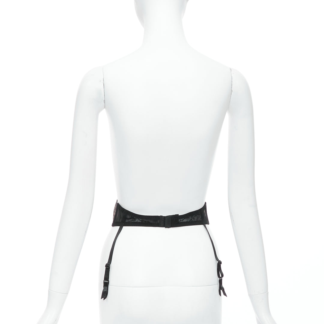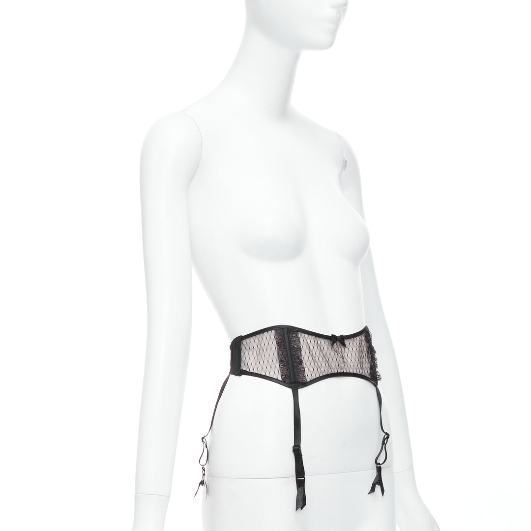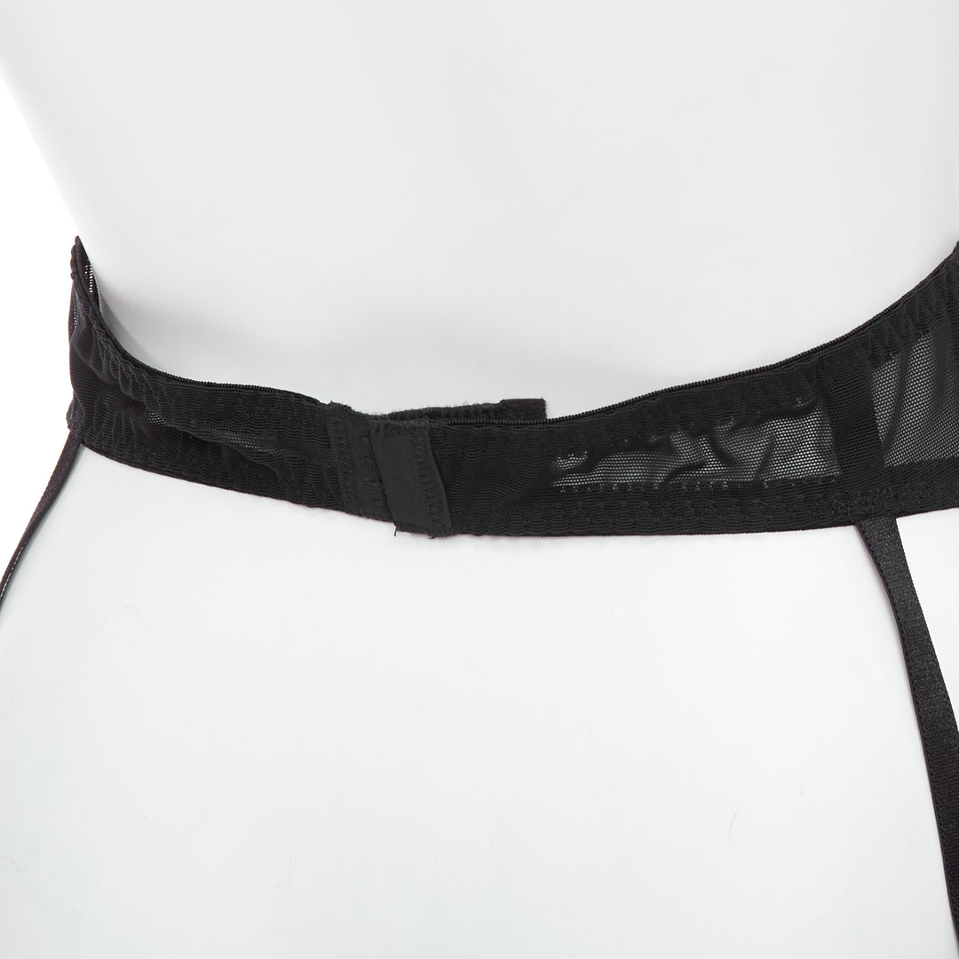 MYLA black intricate lace bow nude mesh garter belt