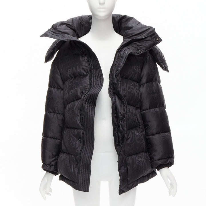 new BALENCIAGA 2019 black all logo jacquard Swing hooded quilted puffer coat FR36 S