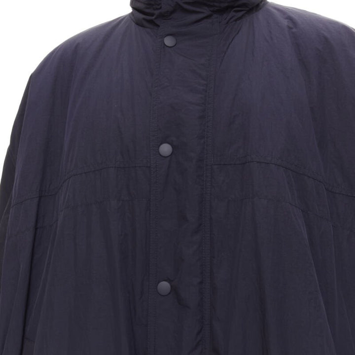Extra Details: Water repellent polyamide outer. Navy blue. Tonal snap buttons and zip front closure. Zip pocket for hood at collar. Dual front pockets. Oversized fit. Fully lined in Balenciaga logo print black cotton lining.