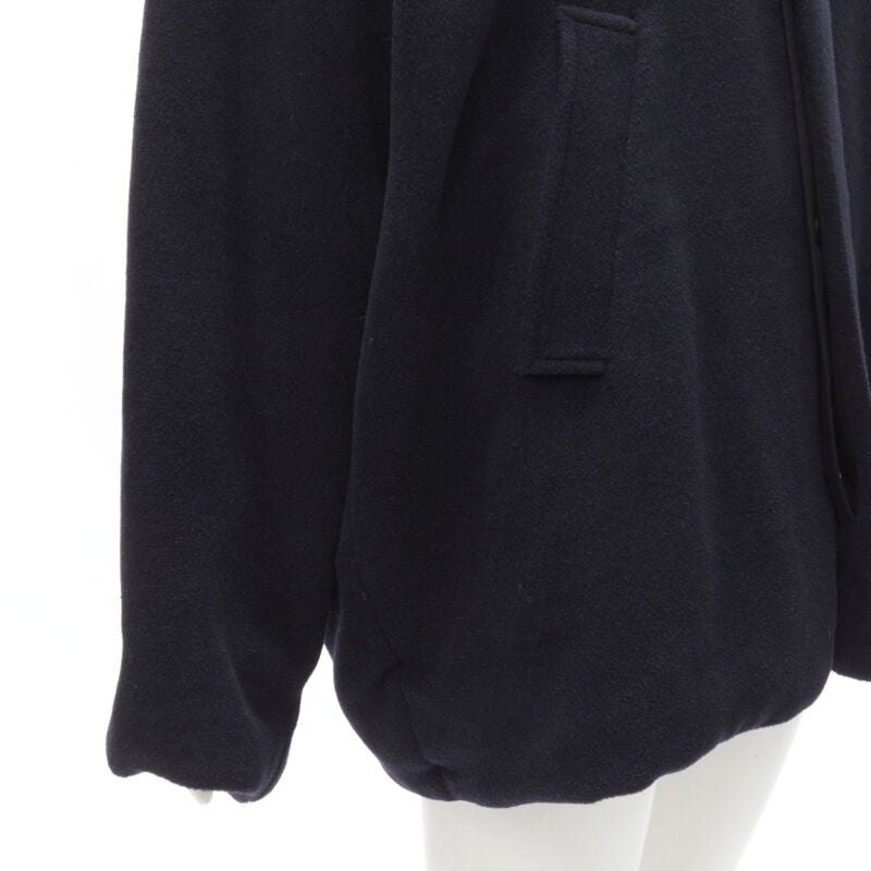 Extra Details: Extremely oversized cocoon coat. Navy camel wool upper. Antique gold-tone decorative button at collar. Spread collar. Dropped shoulder seam. Dual front pockets. Quilt padded lining. Cocoon back silhouette.