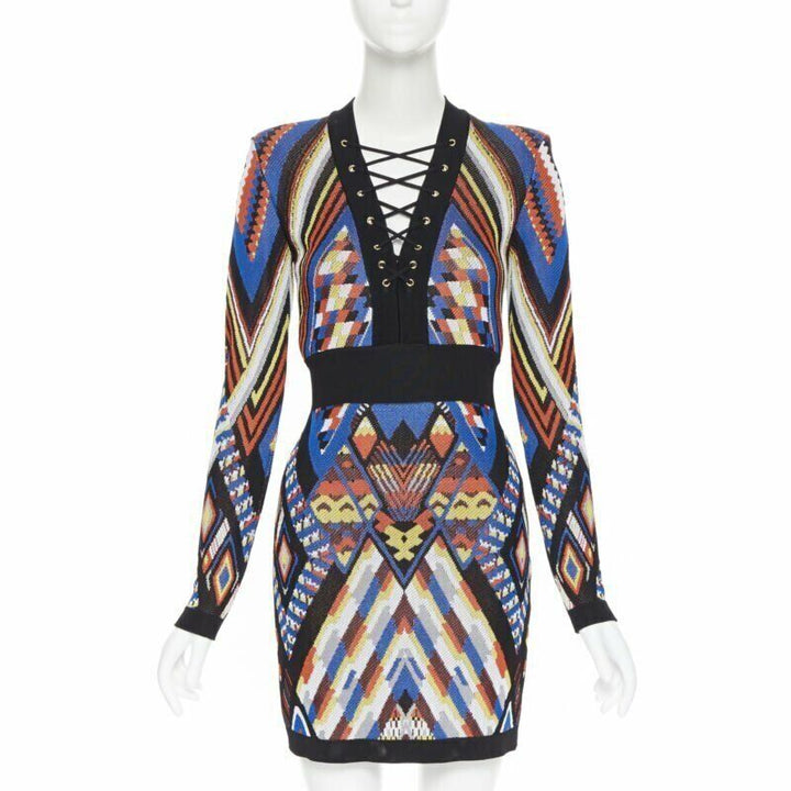 new BALMAIN Runway ethnic tribal knitted lace V-neck bodycon mini dress FR38 M