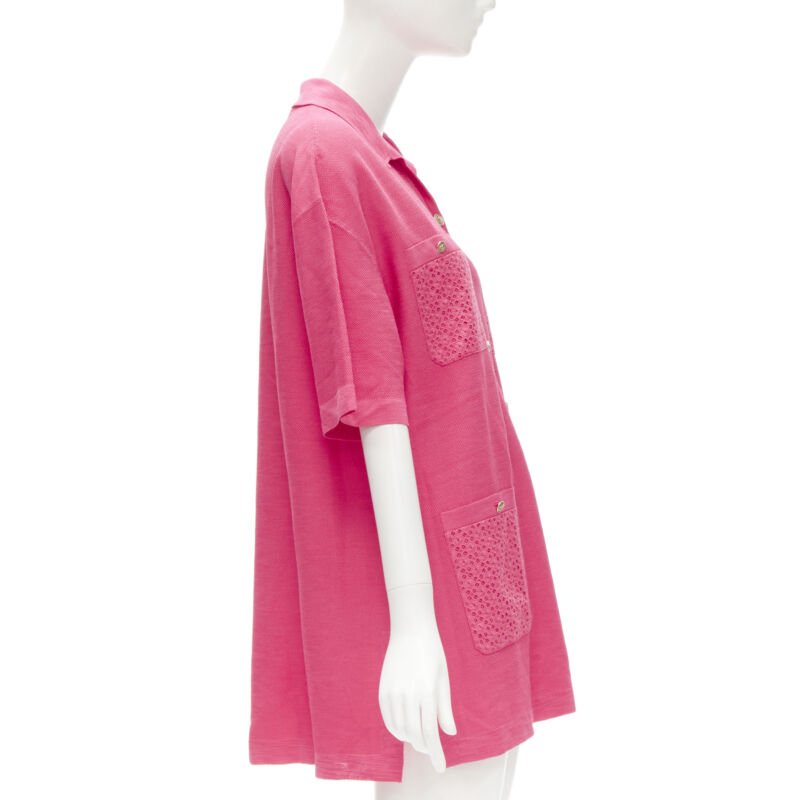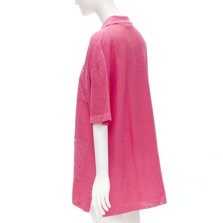 CHANEL pink viscose knit gold CC button embroidery anglais polo dress FR38 M