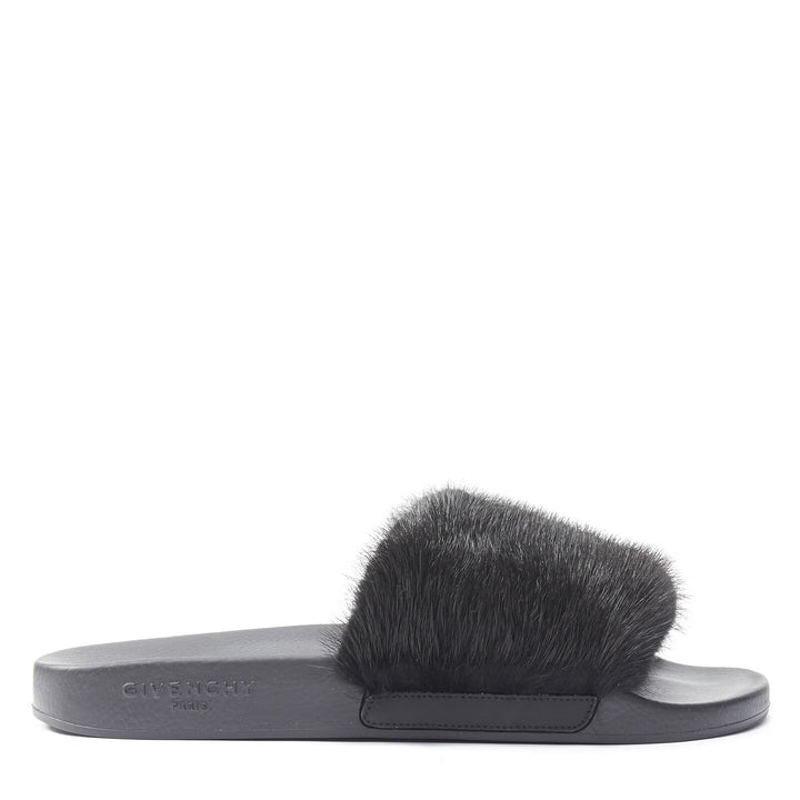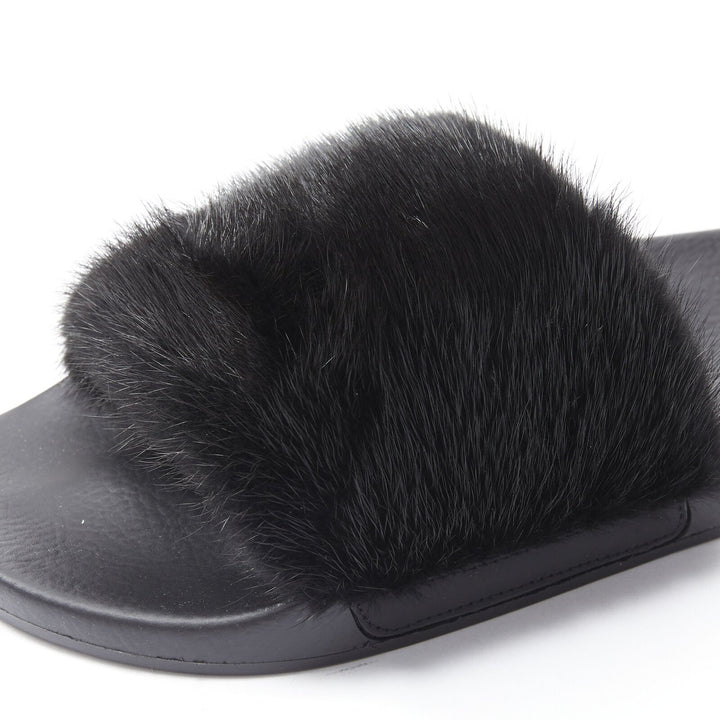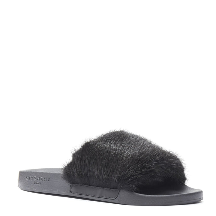 new GIVENCHY black Vison Mink fur logo rubber molded footbed pool slides EU36