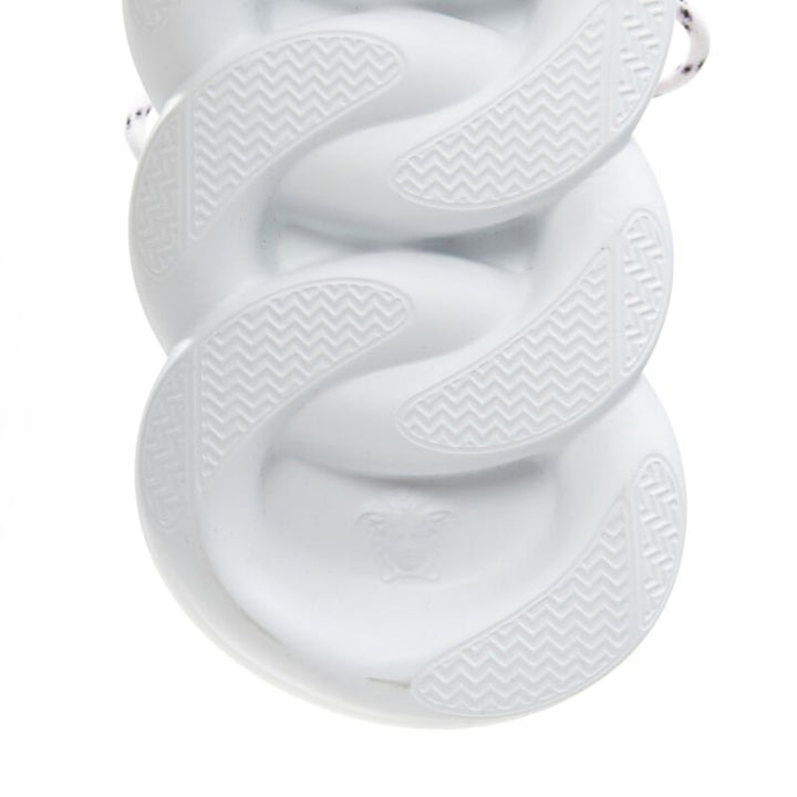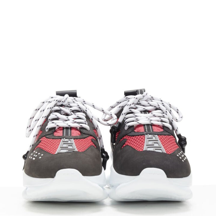 Extra Details: Signature Chain Reaction silhouette by Versace. Embodies the strongest elements of the Versace identity. Characterized by a lightweight, chain-linked rubber sole that takes inspiration from Versace chain jewellery. Rubber dipped laces. Chain link outsole. Braille 'love' lettering. Top stitch. Cupped insole. Central Greek Key print. Mid foot Greca Cage. Rubber Chain Reaction logo on upper tongue. Mesh accents on upper with Calf Leather trims. Rubber Sole. Made in Italy-DSU7462 D37TG DNF. Deadstock sneaker. The Chain Reaction sneaker embodies the strongest elements of the Versace identity. Eclectic details create a one-of-a-kind shoe characterized by a lightweight, chain-linked rubber sole that takes inspiration from Versace chain jewellery. Other signature elements include the iconic Greek Key pattern, the 'Chain Reaction' logo patch and braille 'love' lettering expressing the concept that love is blind.