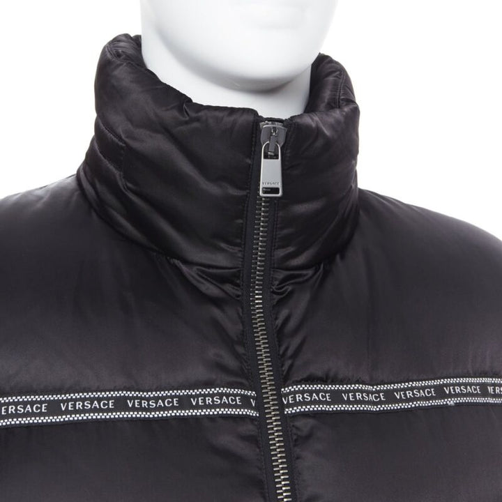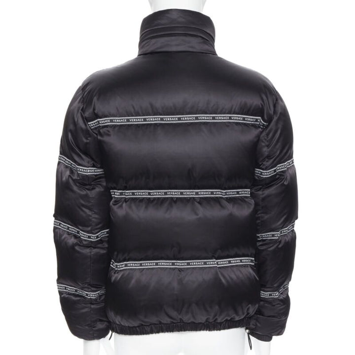 new VERSACE Nastro Stampa black logo ribbon goose down padded jacket IT46 S