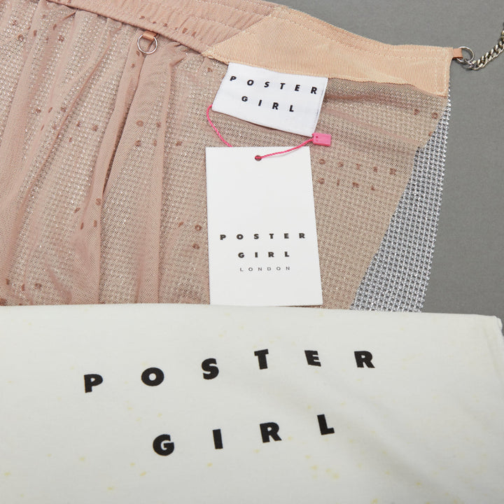 Extra Details: Poster Girl silver chainmail dress Can be styles multiple ways. Cowl neck, adjustable cross-over shoulder straps at open back, detachable skirt overlay, elasticated back waist, side splits, hanging chain with designer plaque, silver-tone hardware, designer-stamped almond tulle lining. Adjustable lobster-clasp fastenings at waist and front. 100% aluminium; lining: 82% nylon, 18% spandex. Hand wash.