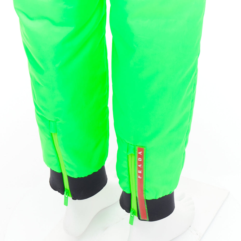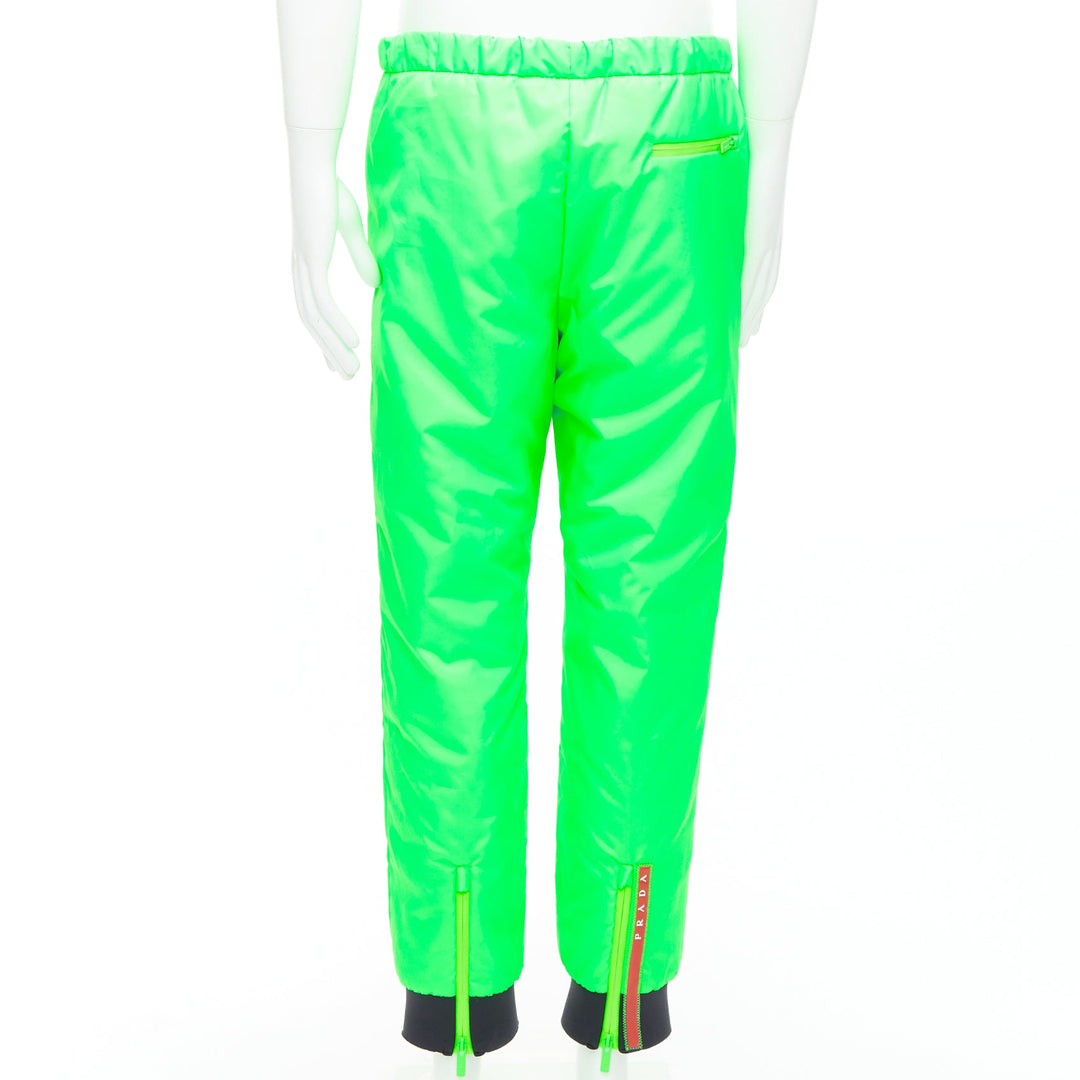 Extra Details: SPG52M style. Primaloft Insulation technology for breathable stretch performance for active sports. "Pistachio" neon green colorway. Stretch waist with toggle loop on ins.de Dual zipper front pockets. Single zip back pocket. Black neoprene cuffed hem. Waterproof zip detail at back hem. Signature Prada Linea Rossa rubber logo on back right leg.