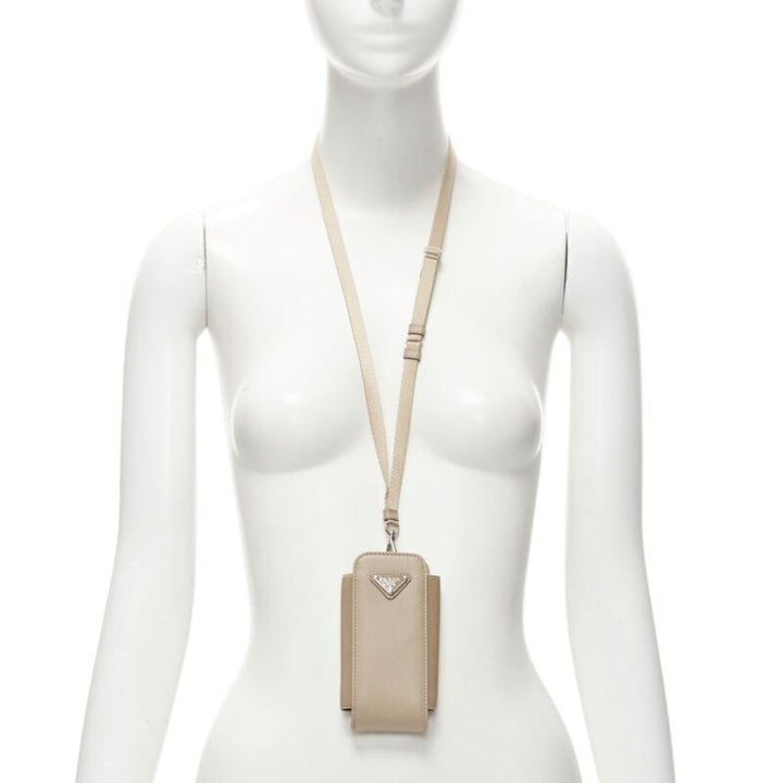 PRADA Symbole Triangle logo saffiano leather Phone lanyard bag beige nude
