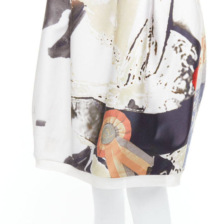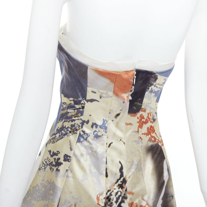 Extra Details: 100% silk. Silk-screen print of Queen Elizabeth II Union Jack collage print. A strapless silk evening dress with a fitted bodice and bubble skirt. The interior of the bodice has a built-in-bustier with bra cups and boning. The dress has a zip closure at the back and an internal zip closure for the interior bustier. The bodice has a sheer pale blue organza trim at the bust and hem of the dress. McQueen referenced construction techniques employed by Norman Hartnell and Hardy Aimes with their mid-century designs. These British couturiers were known for dressing the Windsor Royal Family. Hartnell designed both Queen Elizabeth II and Princess Margaret's wedding gowns.