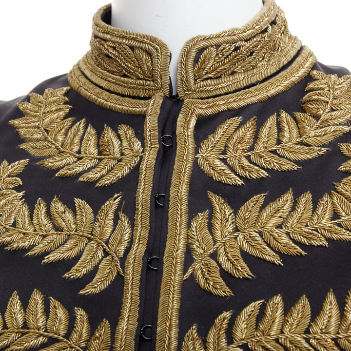 Extra Details: Rich black duchess silk with metallic gold foliage heavy embellishment work. High neck collar. Hook eye closure. Cut out at sleeve that flutters with movement. Slit under sleeves. Cropped military jacket blazer.