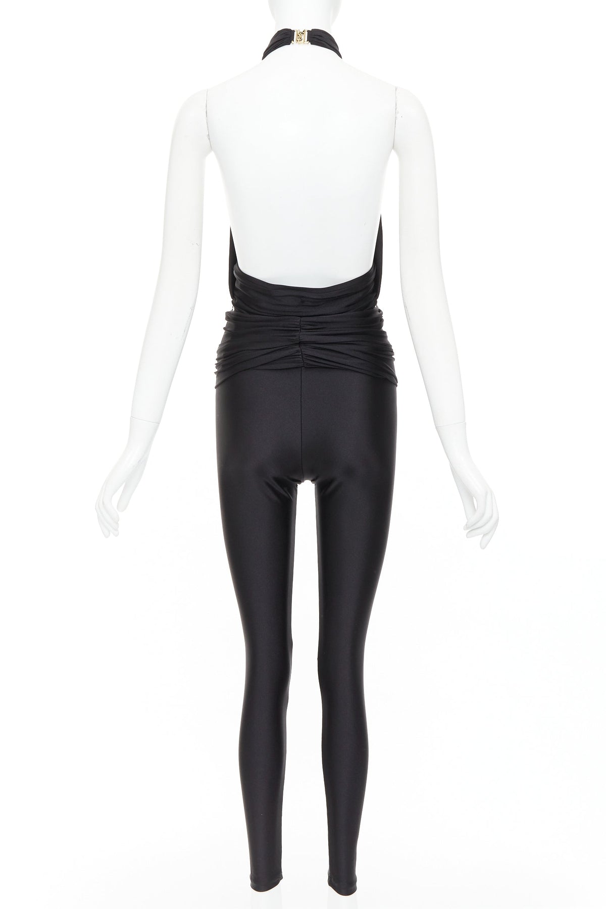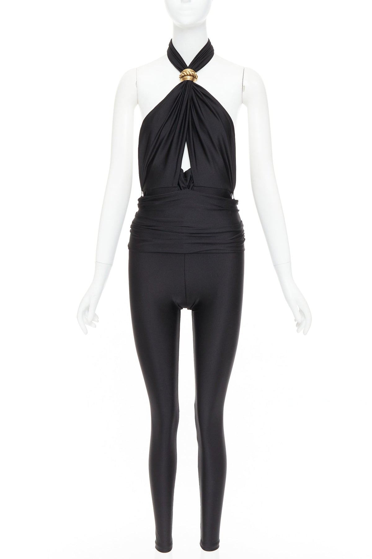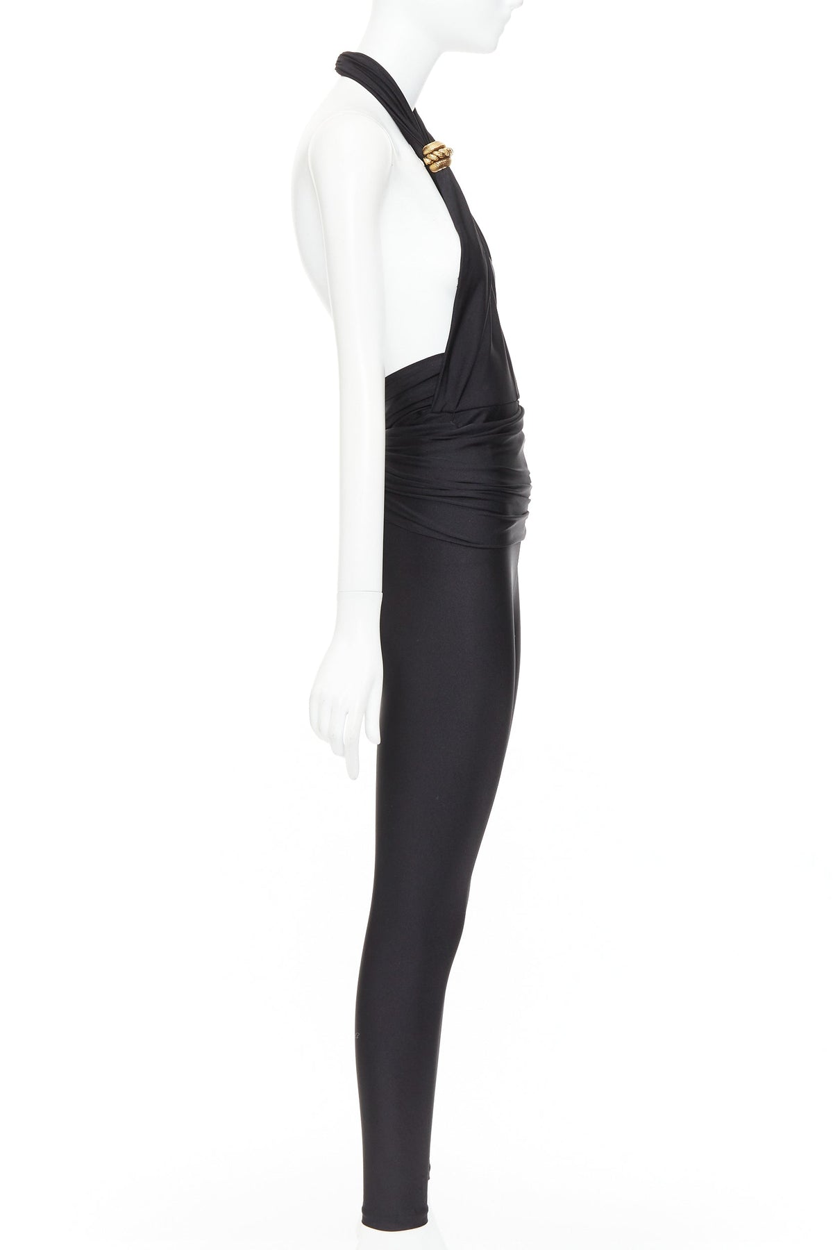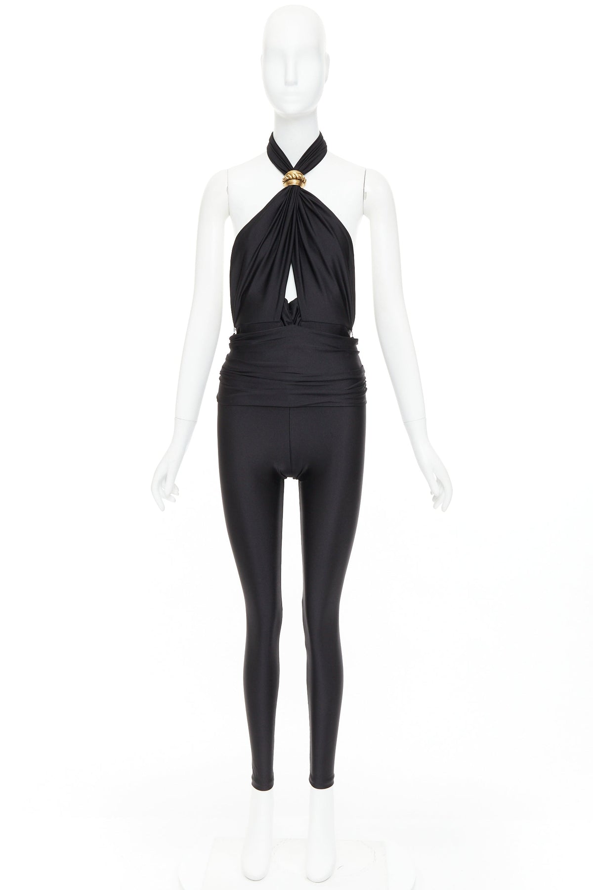SAINT LAURENT 2022 Runway black gold metal brooch halter cutout jumpsuit Sz.2 M