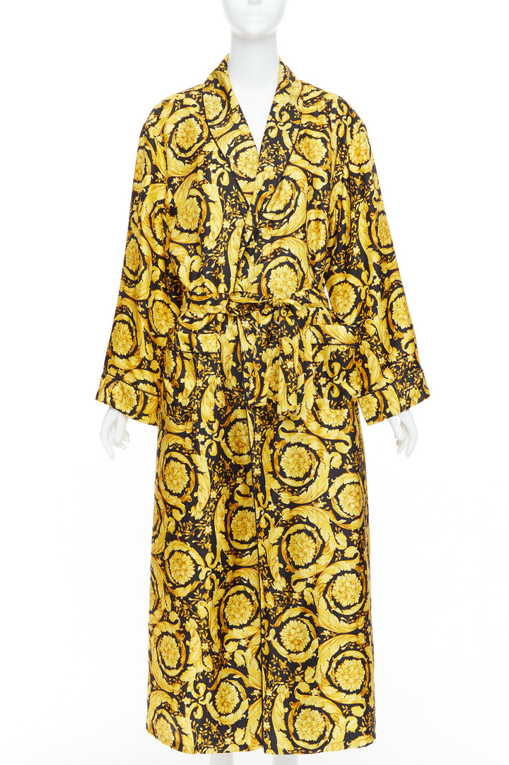Extra Details: Signature Versace Baroque print. Composed of 100% luxurious silk. Shawl collar. Dual patch front pockets. Belt loop with self tie fabric belt in matching print.