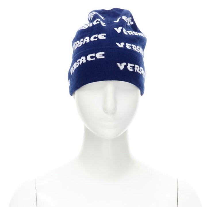 Extra Details: 100% wool. Versace logo monogram in blue and white. Fold up cuffed beanie.