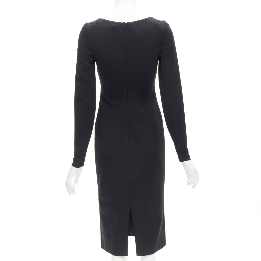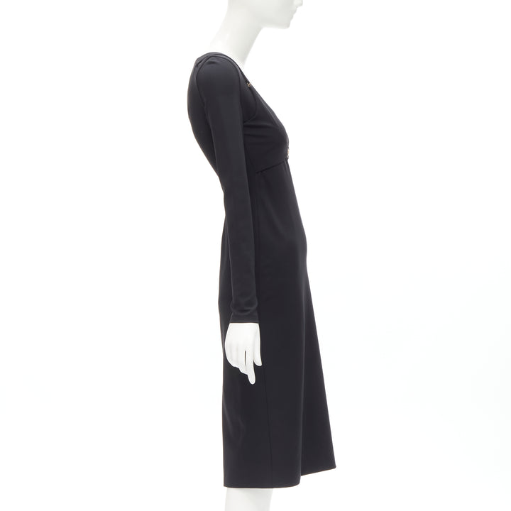 Extra Details: Scoop neckline. Decorative faux layering design or a bustier harness for additional support at bust. Gold-tone Medusa buckle at chest. Fitted sheath silhouette. Zip back closure.