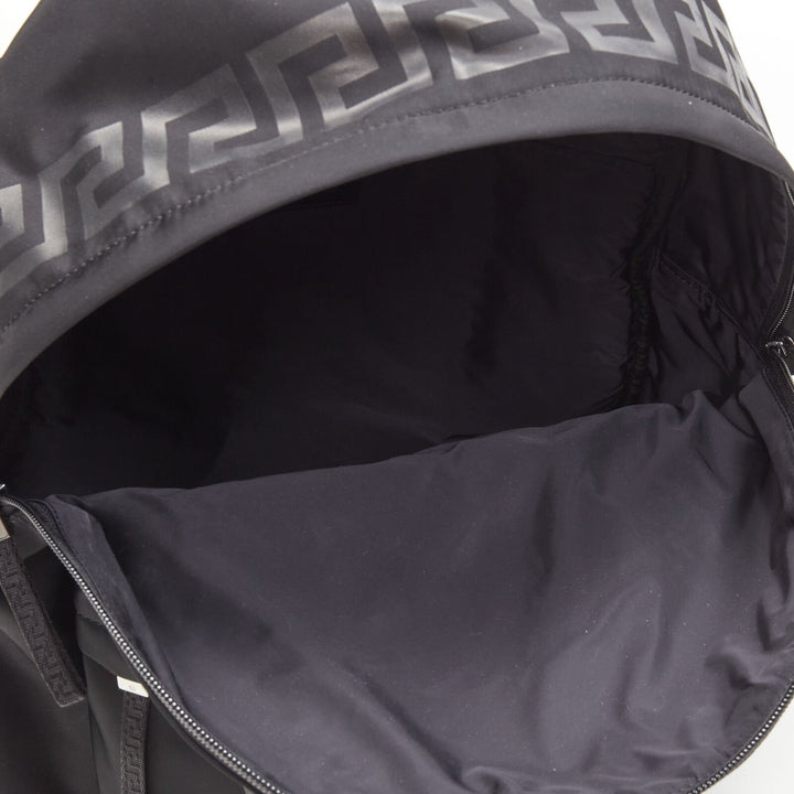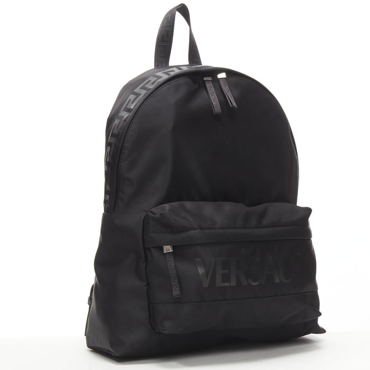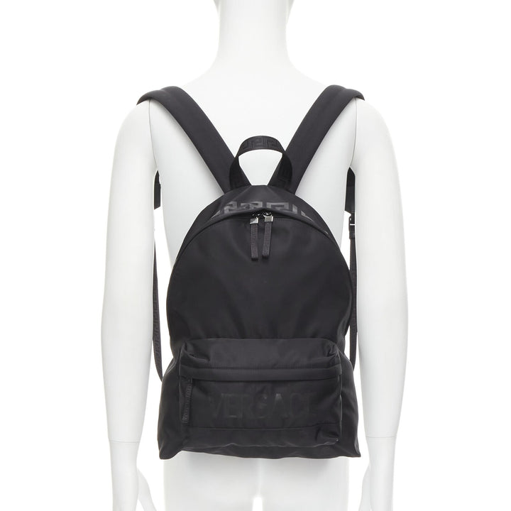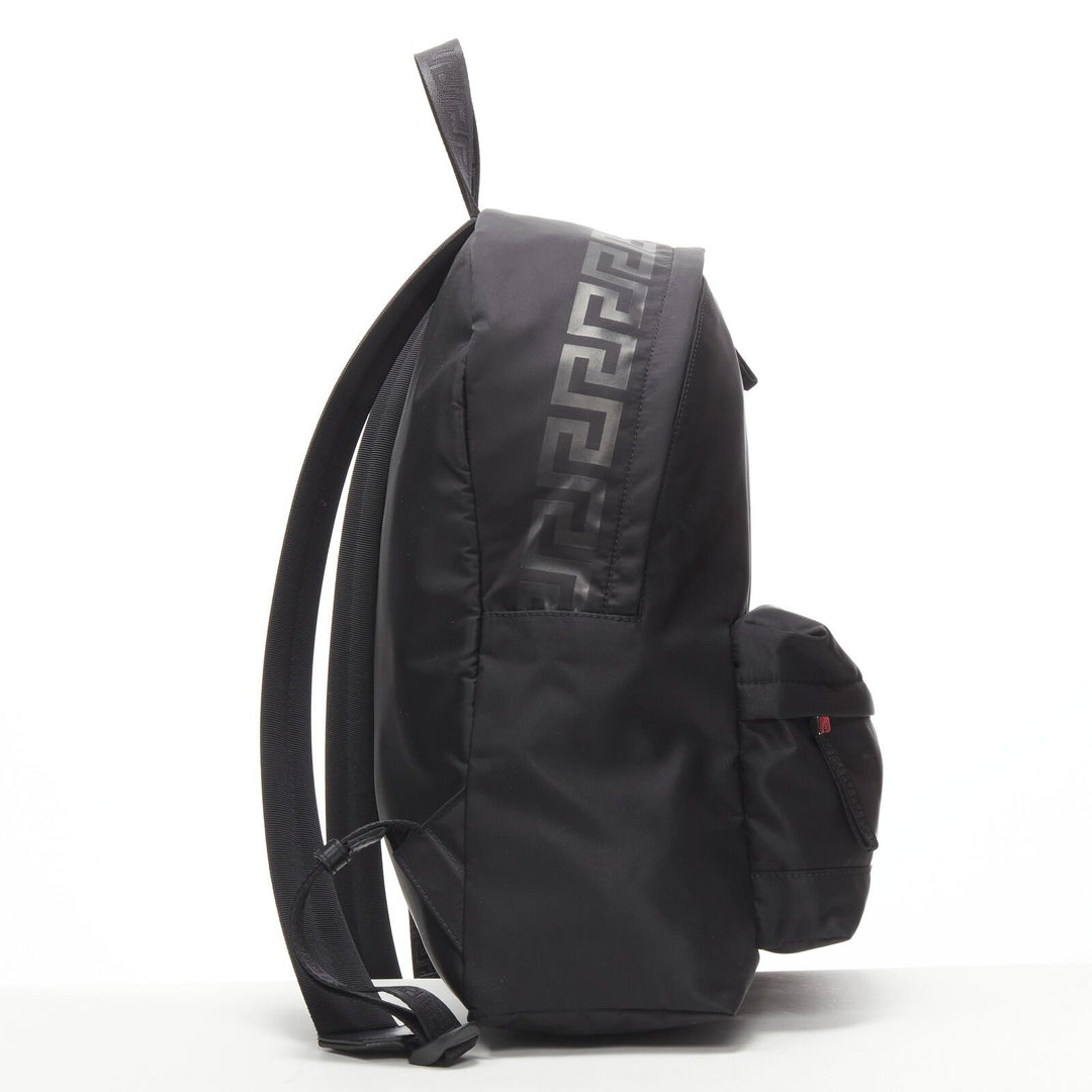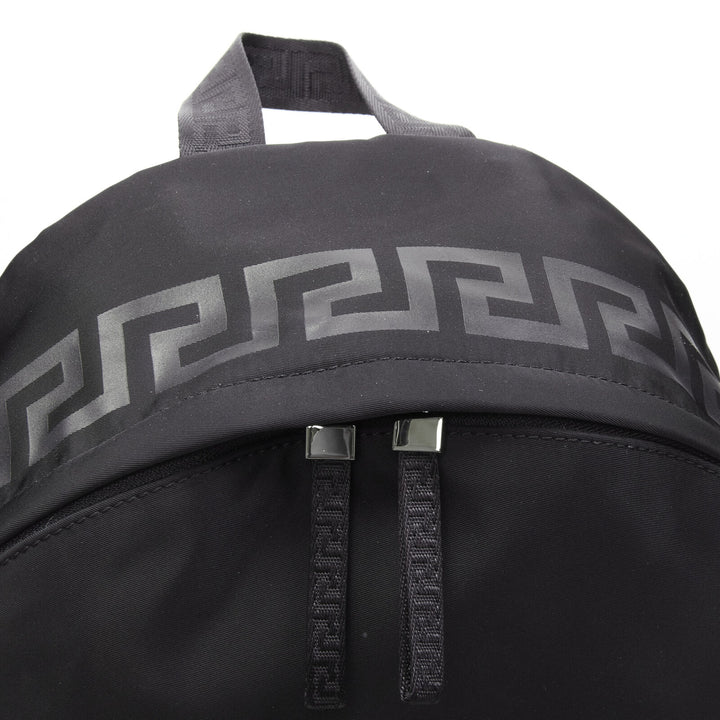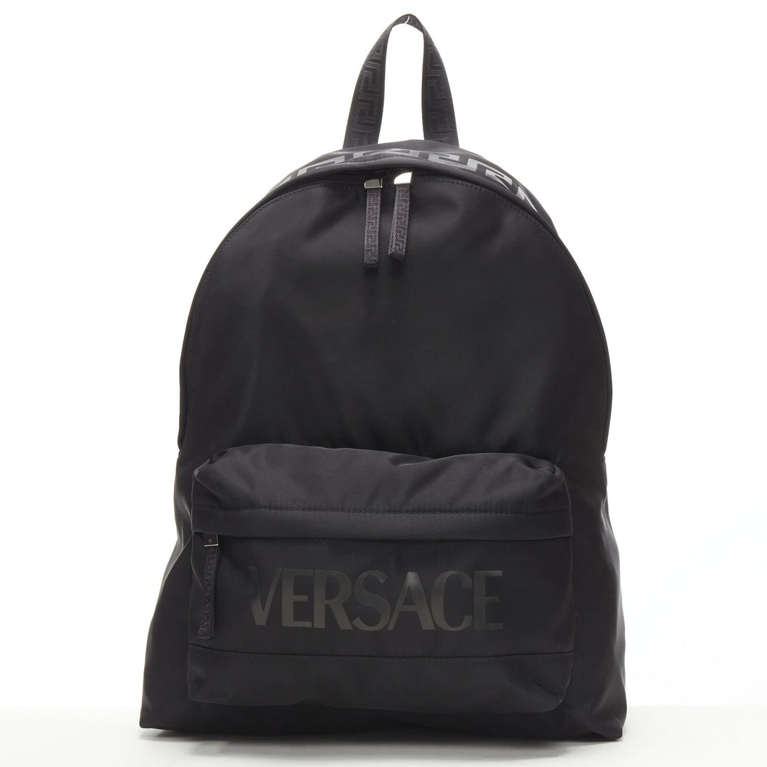 Extra Details: Black technical nylon. Tonal Versace 90s logo print at front pocket. La Greca signature border print around edge. Adjustable Greca patterned shoulder strap. Silver-tone hardware. Dual top zip compartments. Zip front pocket.