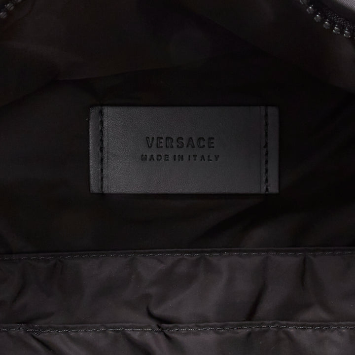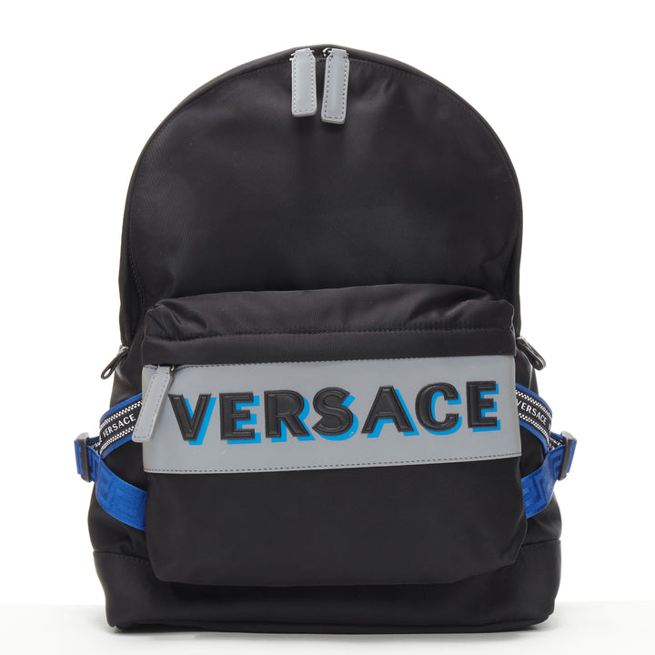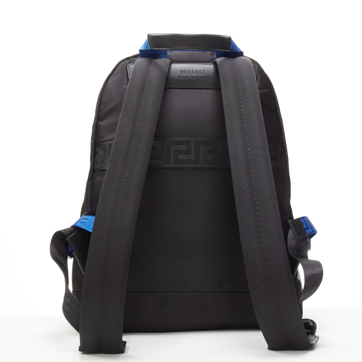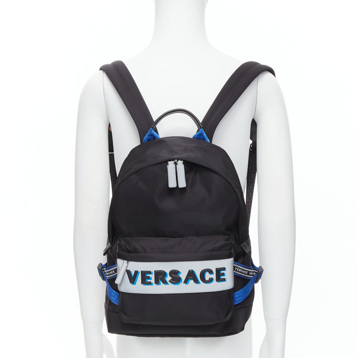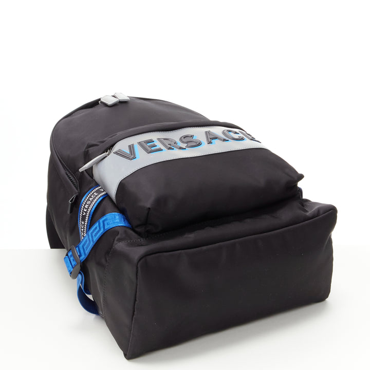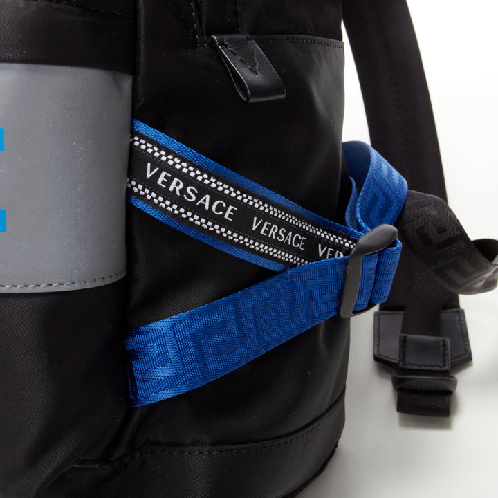 VERSACE Reflective Logo black nylon blue Greca nylon strap backpack