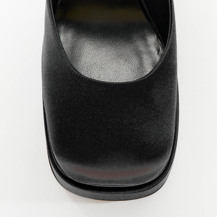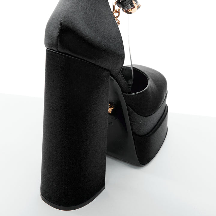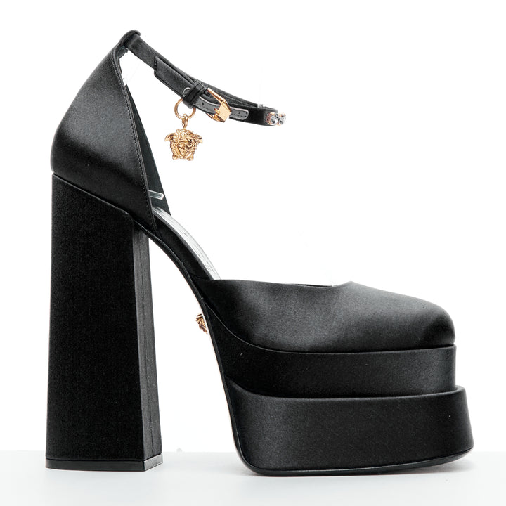 Extra Details: The extremely iconic Versace Aevitas pump in classic black satin. Celebrity favorite straight from the runway- wear these classics forever. These silk-satin pumps from the Aevitas line feature a high-block heel and double platform. The ankle strap is adorned with gold-tone hardware and clear strass crystals with with a single gold-tone signature Medusa charm. Rounded square toe dorsay silhouette.