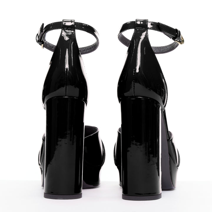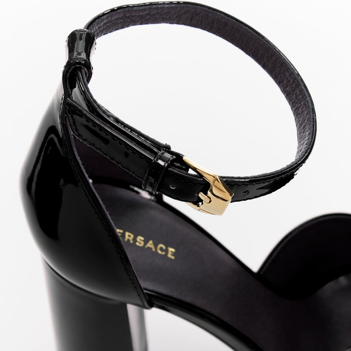 Extra Details: Classic Versace patent platform sandal. "Nero" black shiny patent leather. Gold-tone hardware with tonal black enamel Medusa emblem buckle across toe strap. Chunky heel. Open toe. Platform sole. Ankle strap closure.
