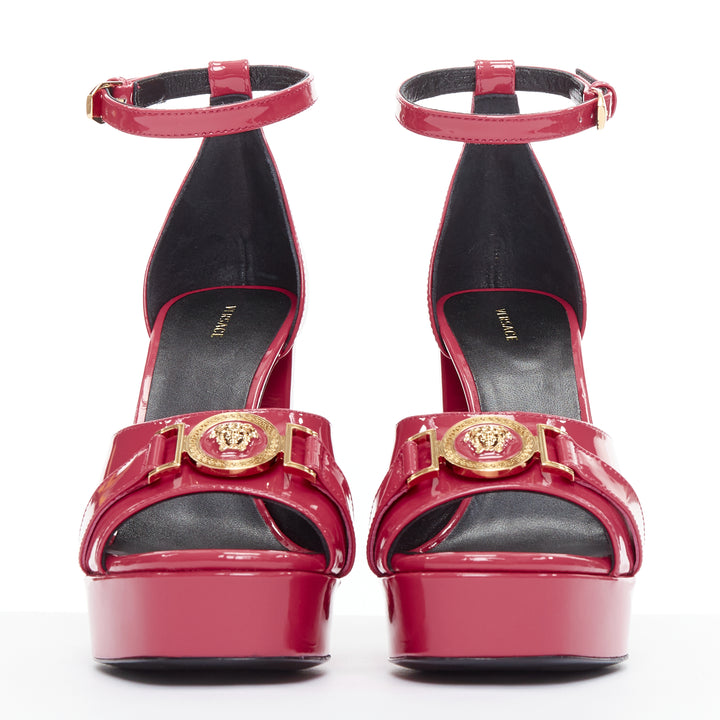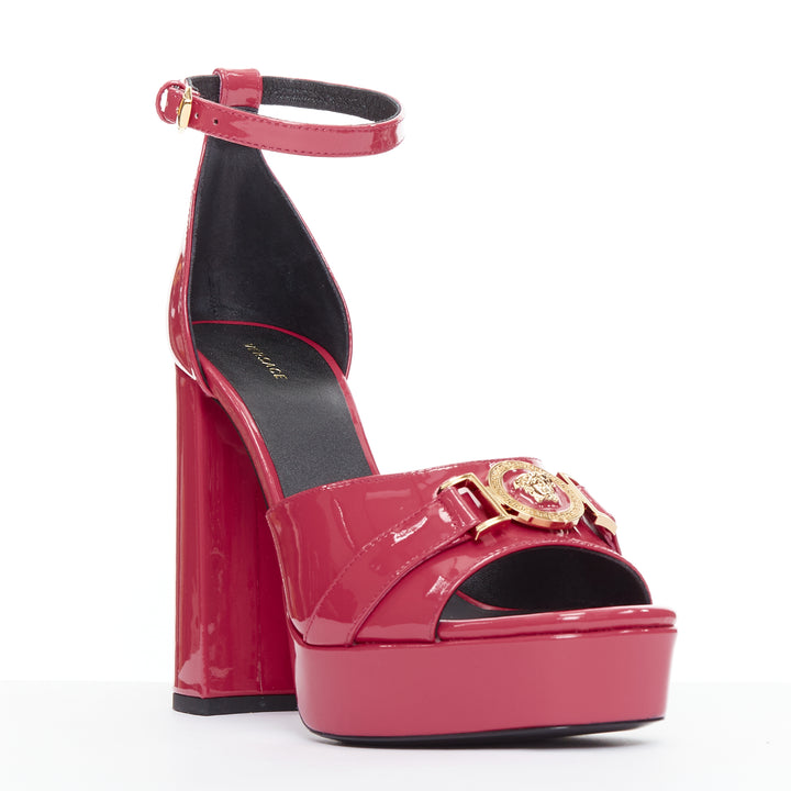 Extra Details: Classic Versace patent platform sandal. "Fuxia" pink shiny patent leather. Gold-tone hardware with tonal pink enamel Medusa emblem buckle across toe strap. Chunky heel. Open toe. Platform sole. Ankle strap closure.