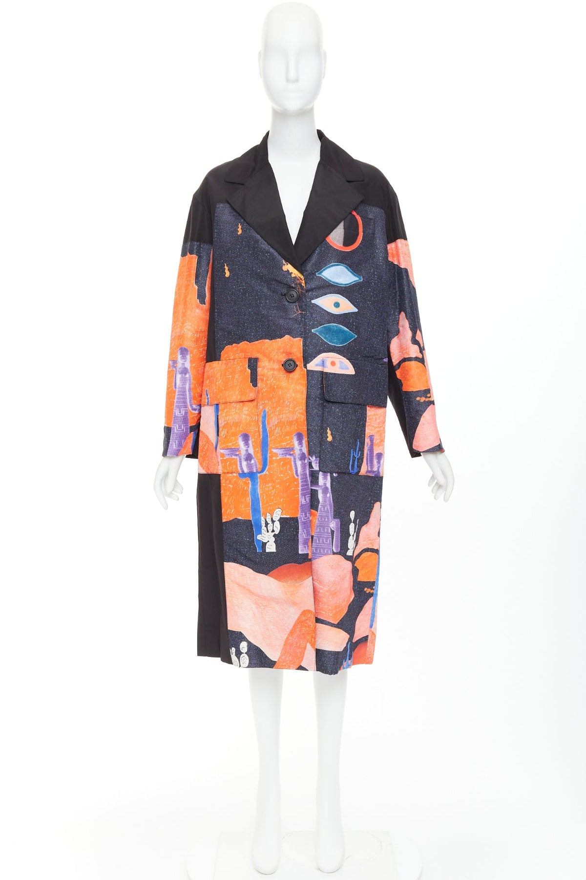 Extra Details: It features a single-breasted design with large buttons, patch pockets, and a knee-length fit. The unique graphics, including the desert landscape and the rows of eyes