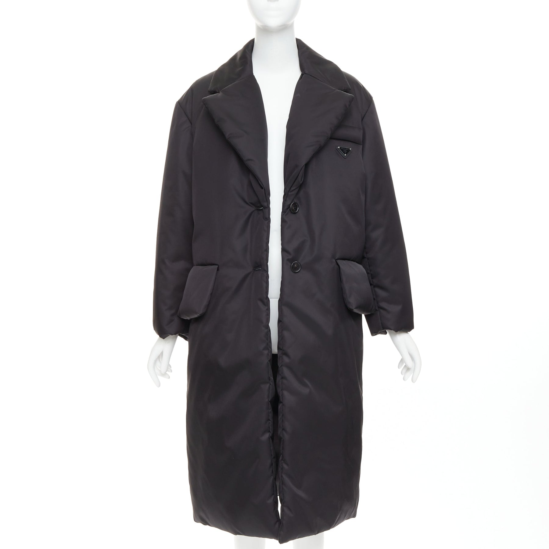 Extra Details: This oversized coat is crafted from innovative Re-Nylon—a sustainable fabric made from regenerated ocean plastic and textile waste. Designed with dropped shoulders, large flap pockets, and a functional goose down and feather padding for warmth, it blends style and functionality. The silhouette can be cinched using the detachable or adjustable buckled waist belt, and the coat is finished with the iconic enameled metal triangle logo displayed on the chest pocket