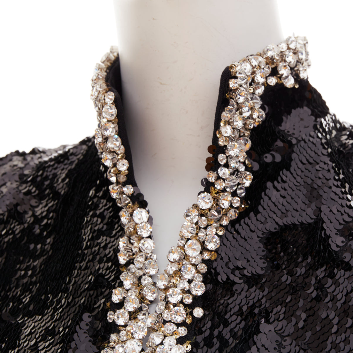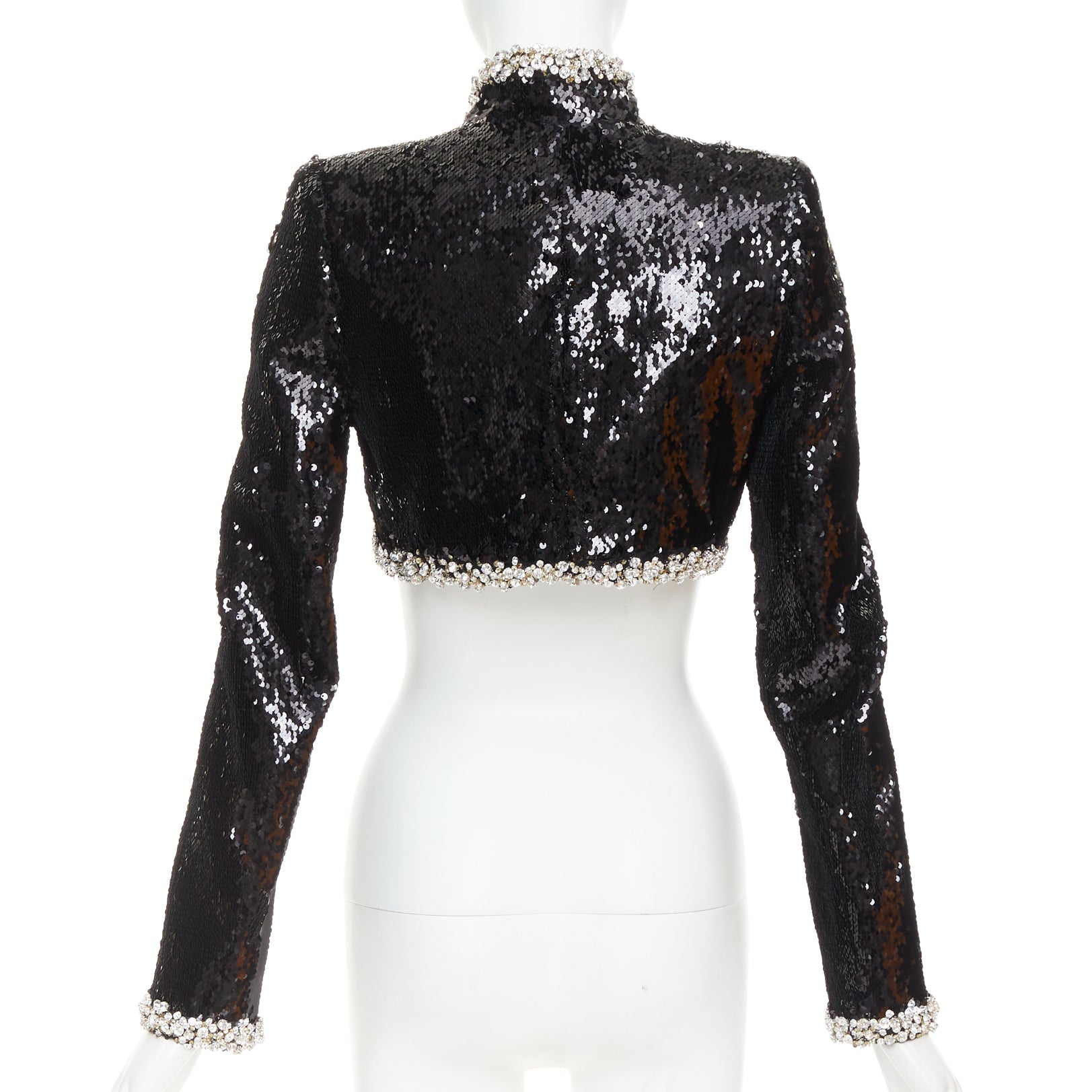 Extra Details: Black paillette sequins cropped jacket. Silver crystal strass rhinestone and gold-tone micro sequin embellishment bordered. Stand collar. Padded shoulder. Dual hook eye closure at front.