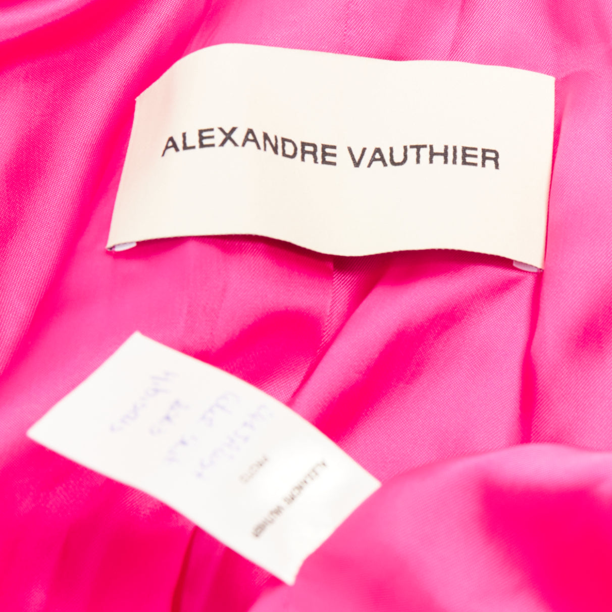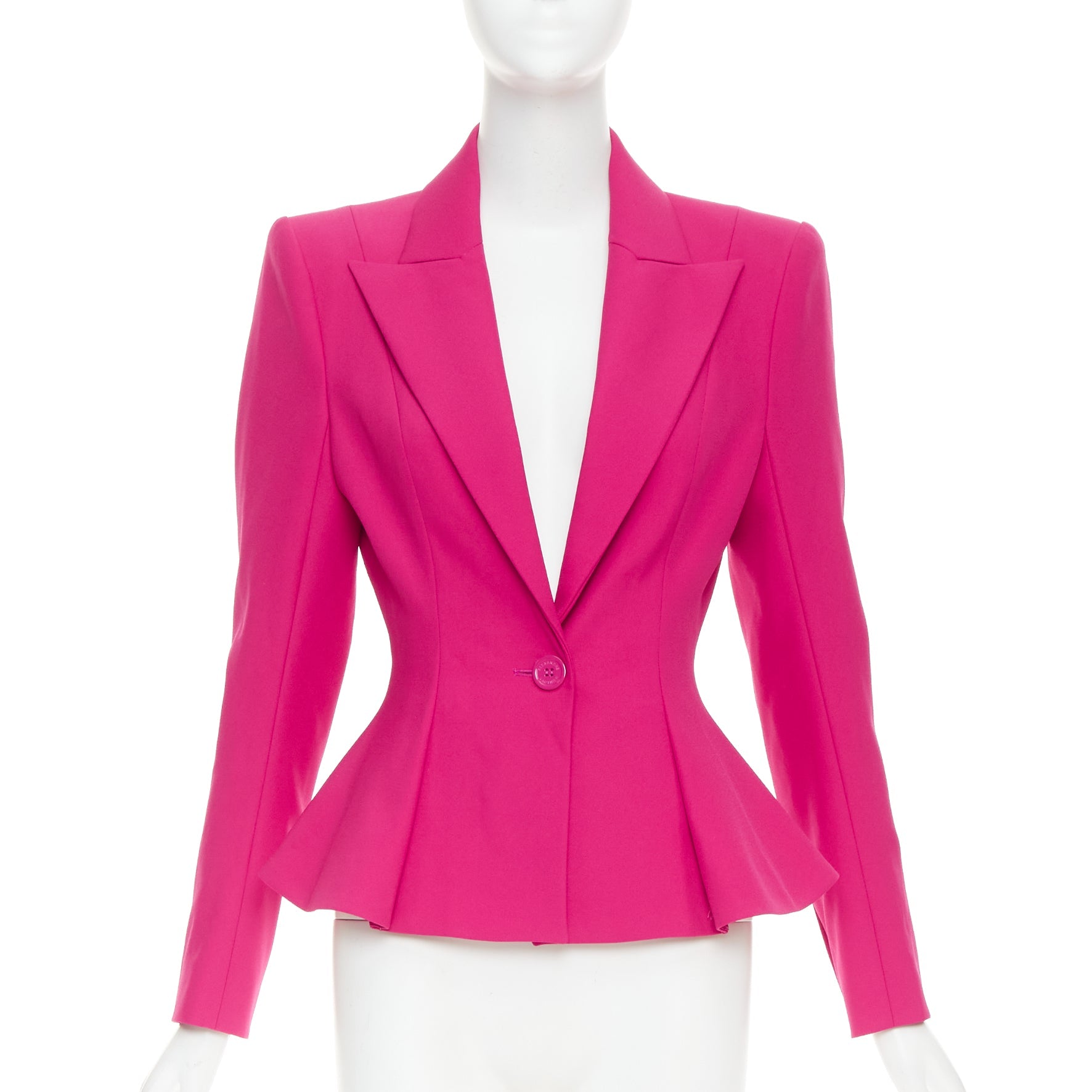 Extra Details: Alexandre Vauthier single-breasted peplum blazer in fuchsia. It is constructed from a wool crepe fabric, features peak lapels, structured oversized shoulders with pads, and a single button fastening at the front. The defining characteristic is the fitted, cinched waist that flares out into a short peplum hem.