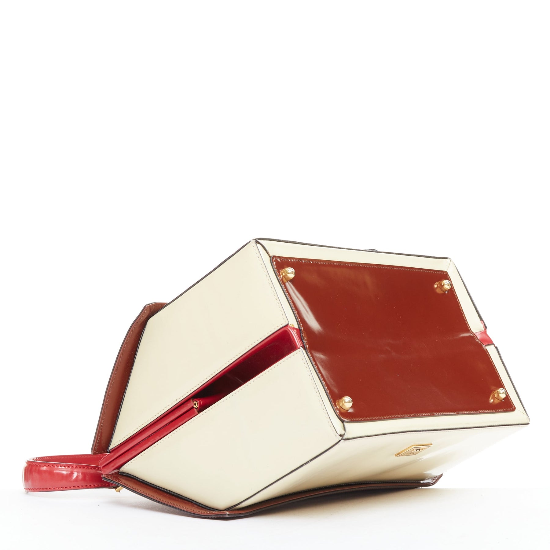 Extra Details: Rare vintage Moschino novelty handbag shaped like a house. Made of dark red and cream beige patent leather. Features sturdy top handle and gold-tone metal parts. Has "Maison Moschino" slogan across the roof. Mirror behind the front door. Protective feet at bottom. Interior lined in black signature fabric. Made in Italy.