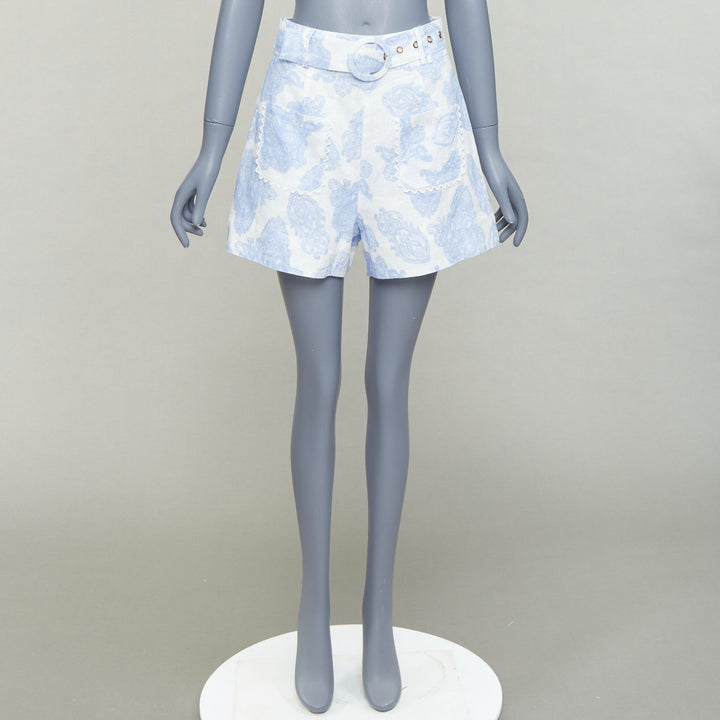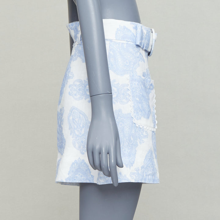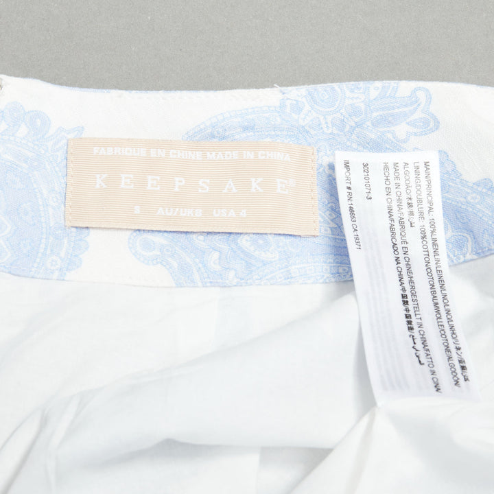 KEEPSAKE white blue linen paisley print cotton lined belted shorts S
