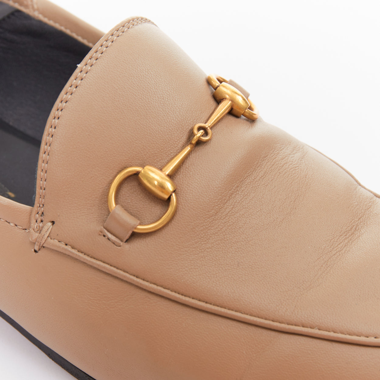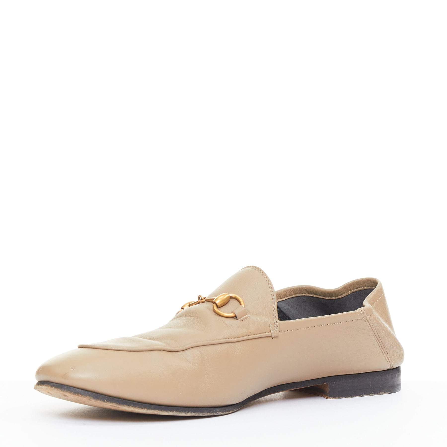 Condition: Fair, this item was pre-owned and is in fair condition. Please refer to image gallery for thorough condition check. The loafers are in fair condition, exhibiting visible creasing across the toe boxes and at the heels from being worn in the convertible mule style. There is a scuff mark on the front leather of the right shoe. The antique gold Horsebit hardware remains bright, and while the leather uppers show signs of regular use